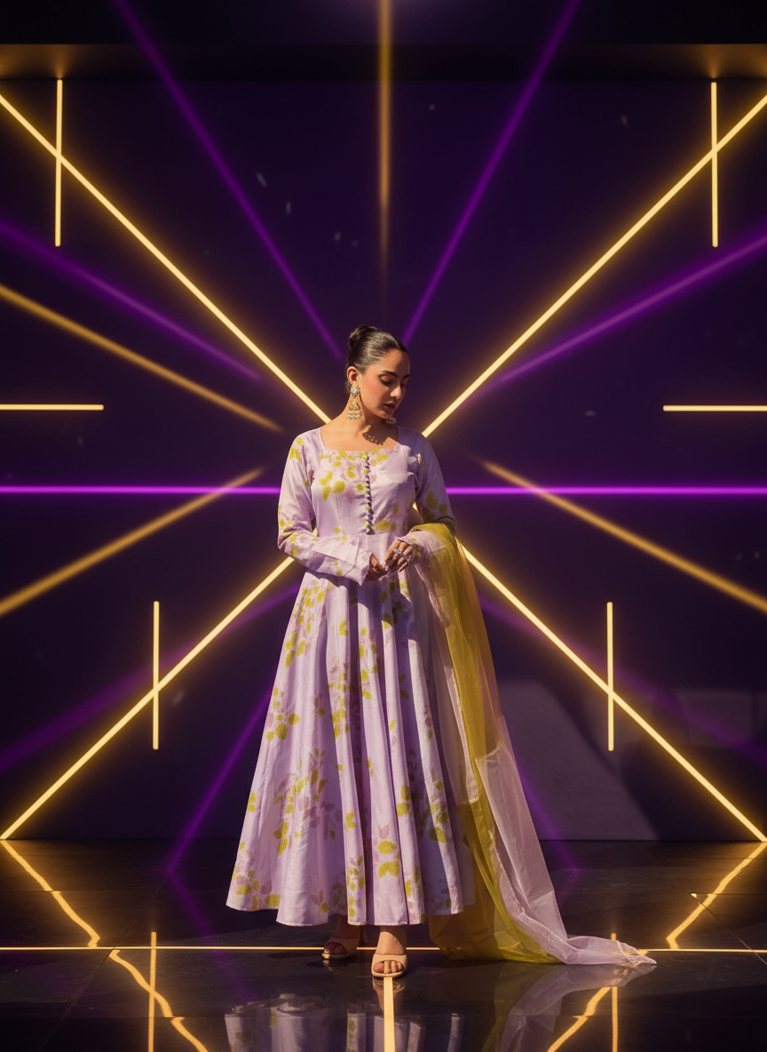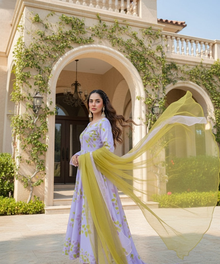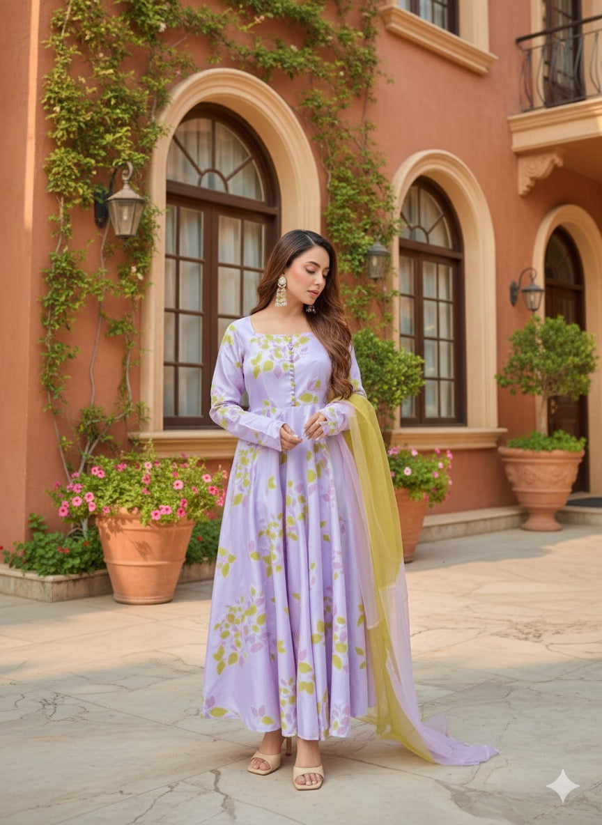 Details: Beautifully crafted with perfection from the floral screen printing to full flair frock, boat neckline, full sleeves with net two tone dupatta.