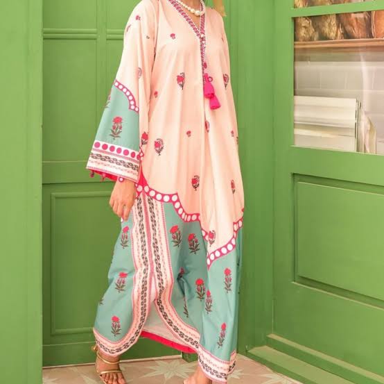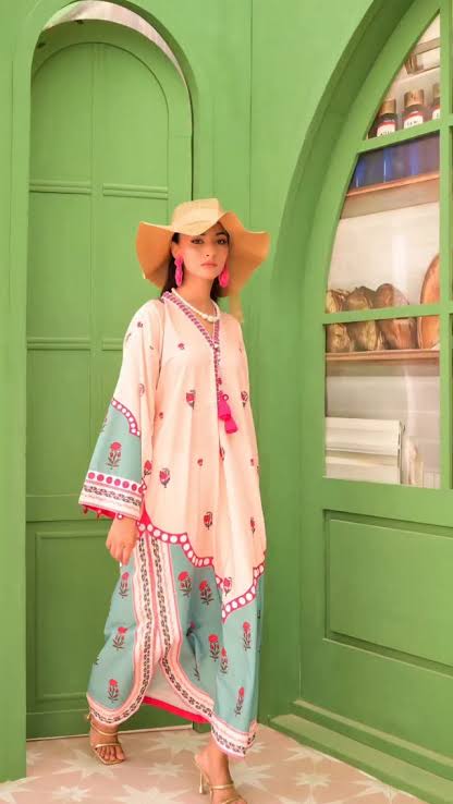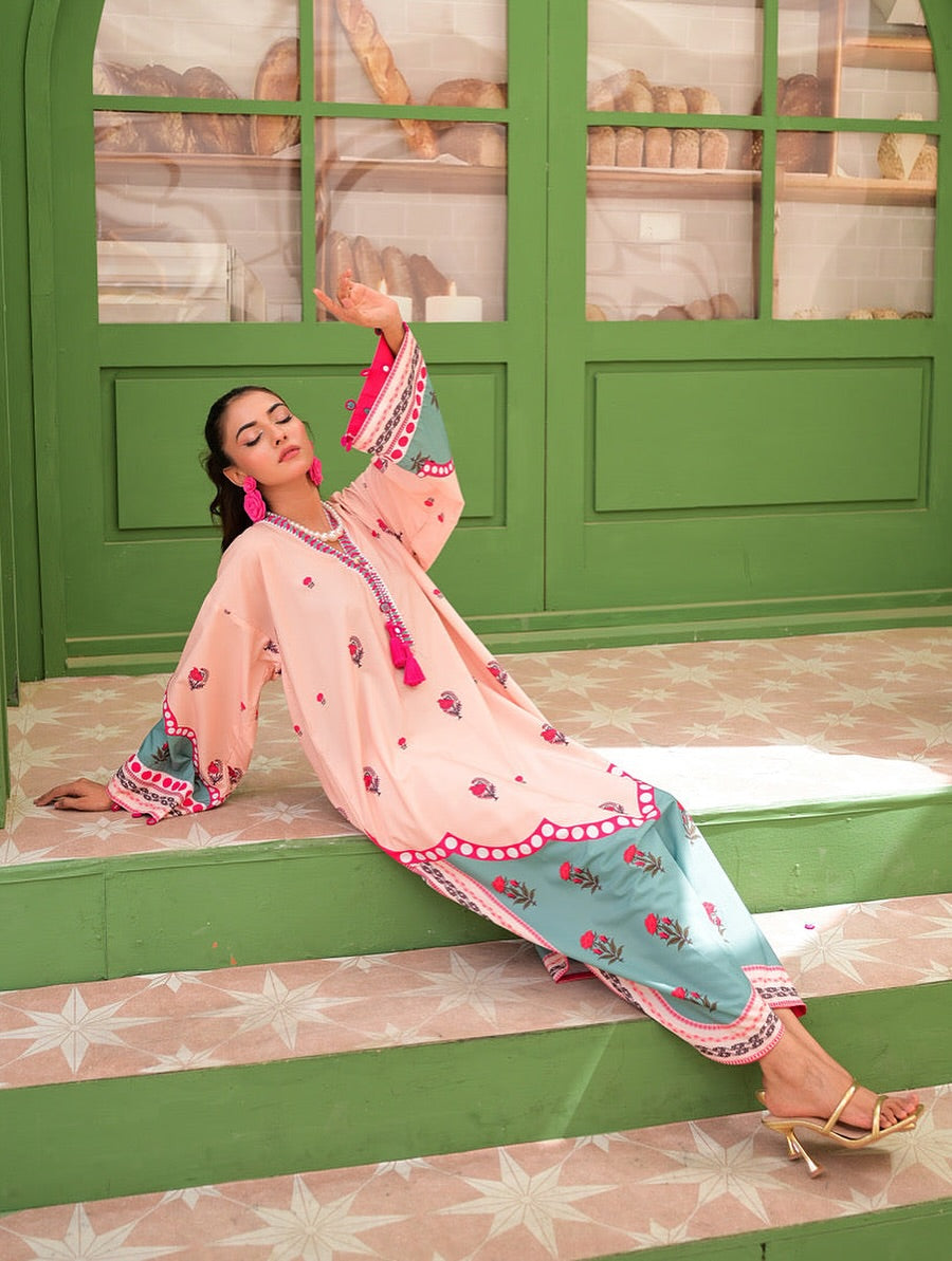 Beautiful stitched long shirt featuring elegant prints on whole with slits on sleeves that showcases beautiful complimenting color pop detailing.