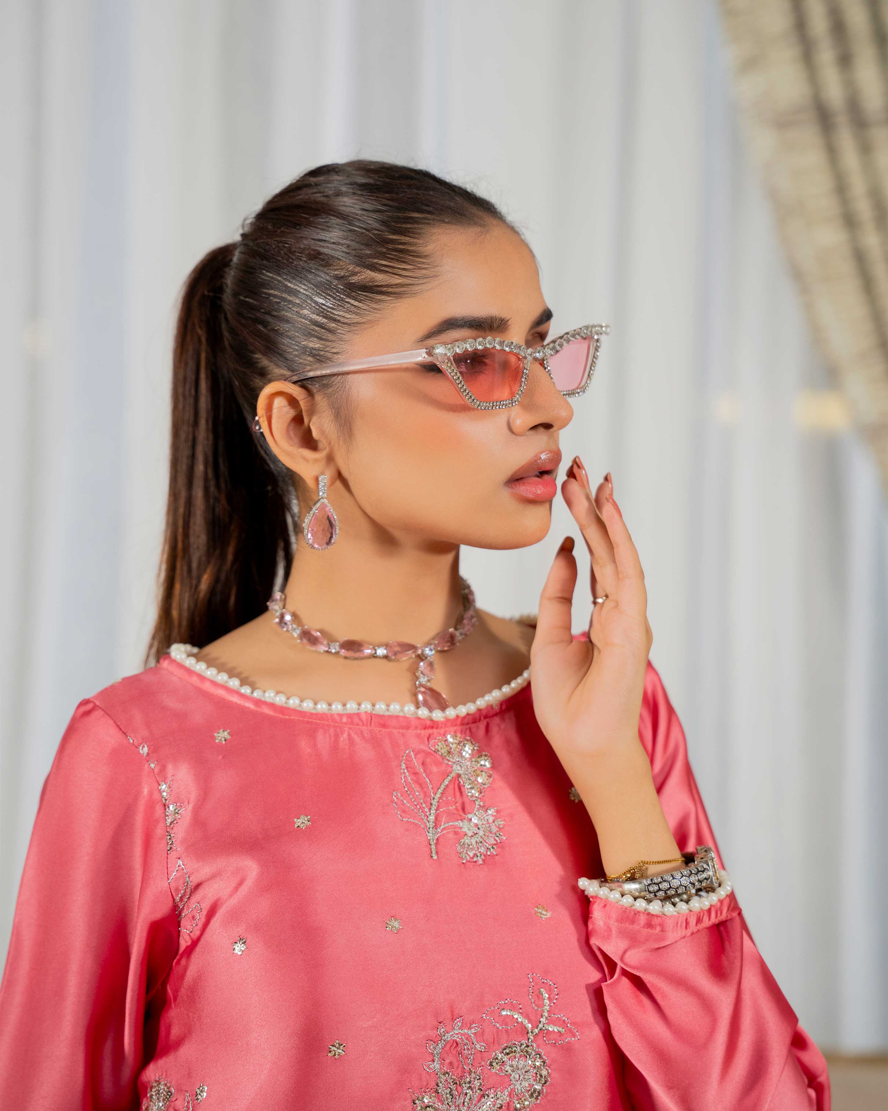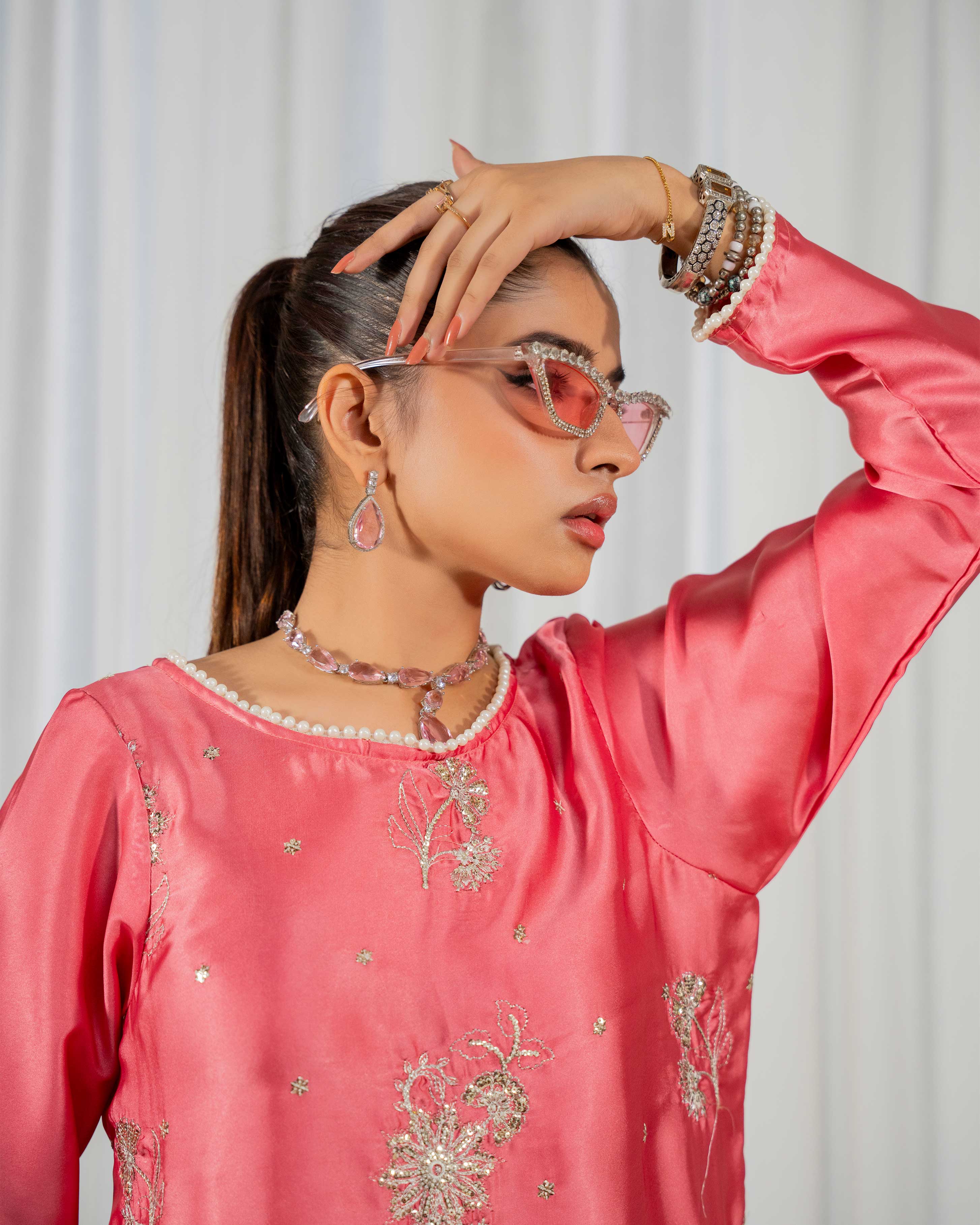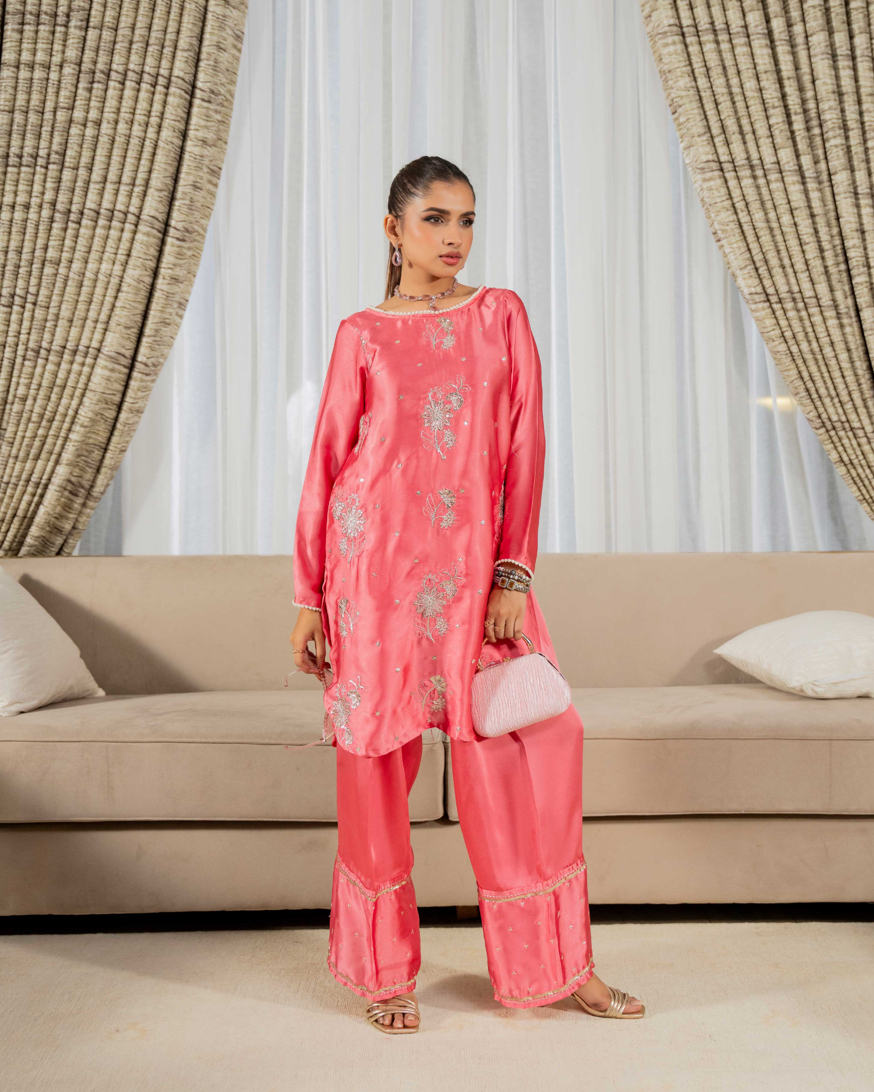 Beautiful stitched shirt and trouser featuring delicate embroidery in tilla with sequin work and boat pearl neckline.