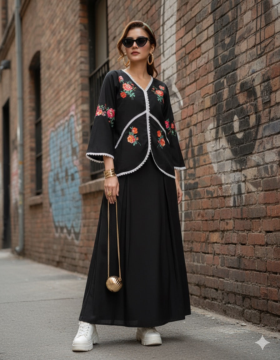 Beautiful stitched short shirt with a pleated skirt featuring complimenting  floral  print .