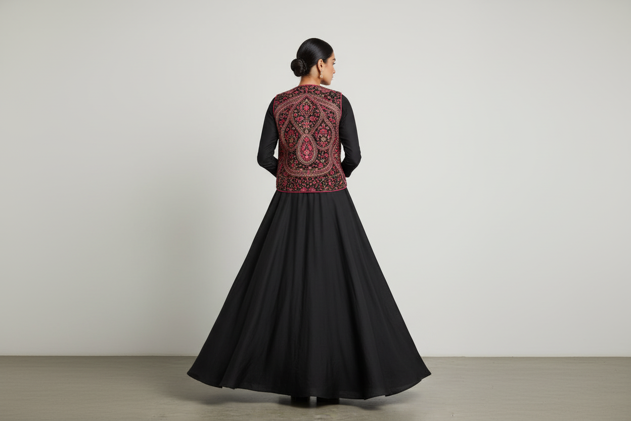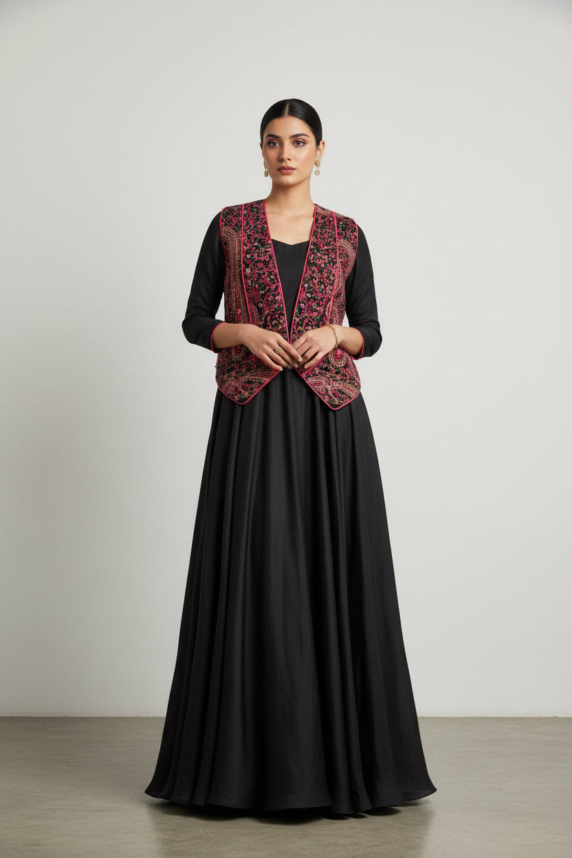 Details: Stylish flora print jacket with all black flary frock.