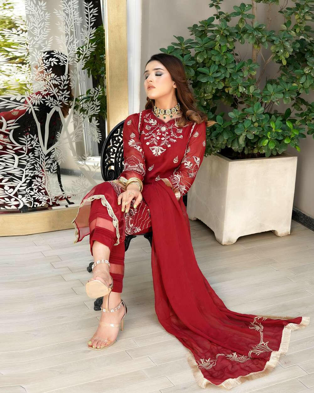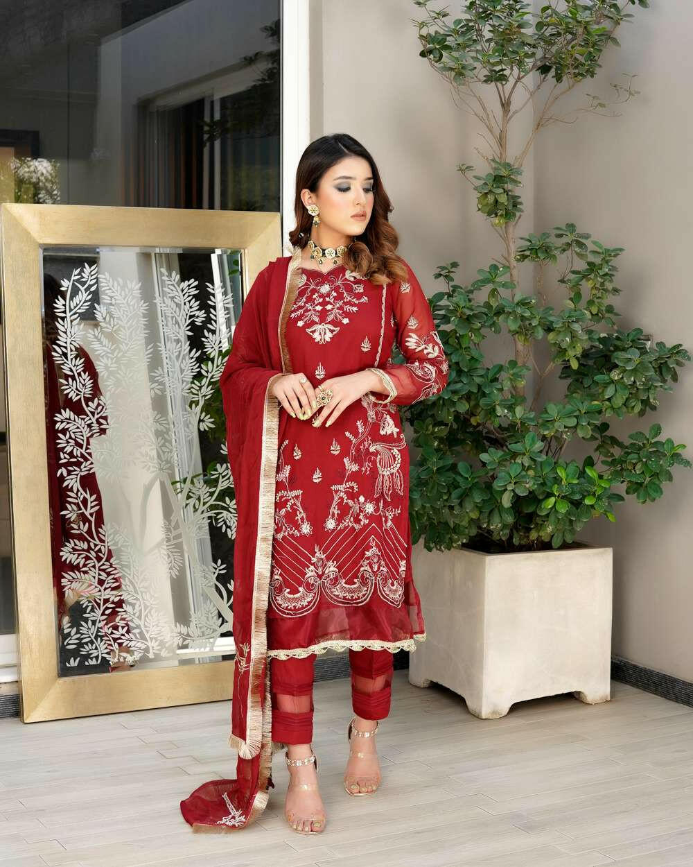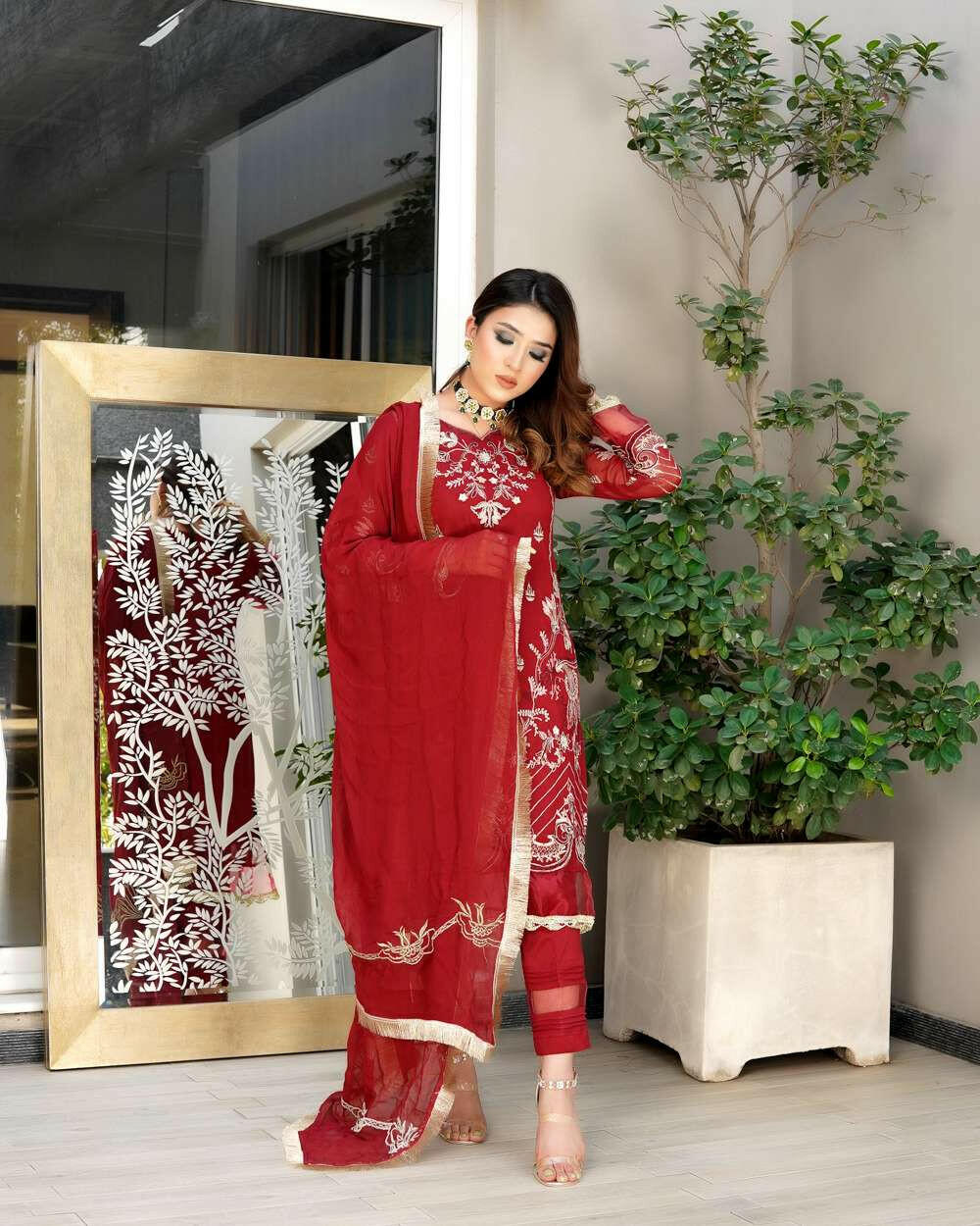 3-piece Shirt Fabric: Premium Quality Chiffon Shirt Length: 41-43 inches Pants fabric: Premium Quality Grip Dupatta Fabric: Premium Quality Chiffon Color of the product slightly vary due to photographic lighting or your device settings.
