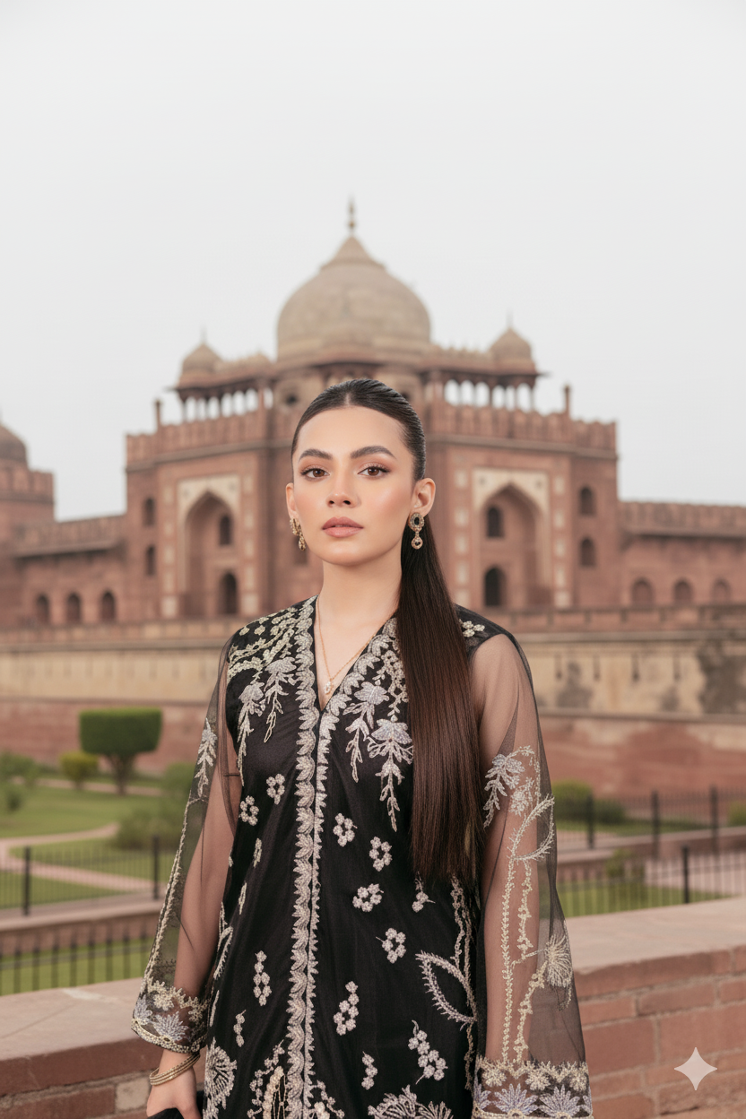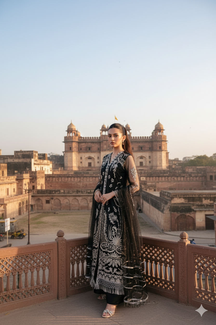 Stand out this season with this all black outfit features v style neckline and dupatta in black.