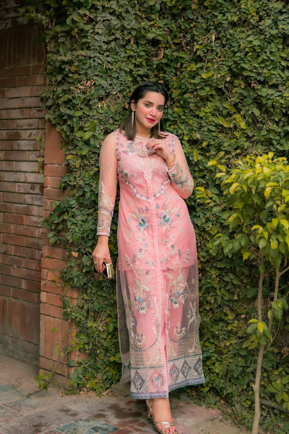 This delicately designed 3pc is fusion of fresh colors of purple with golds and white embroidery on this gorgeous pink gown and decently paired with sleeveless shirt and pants is a perfect festive look for this season.