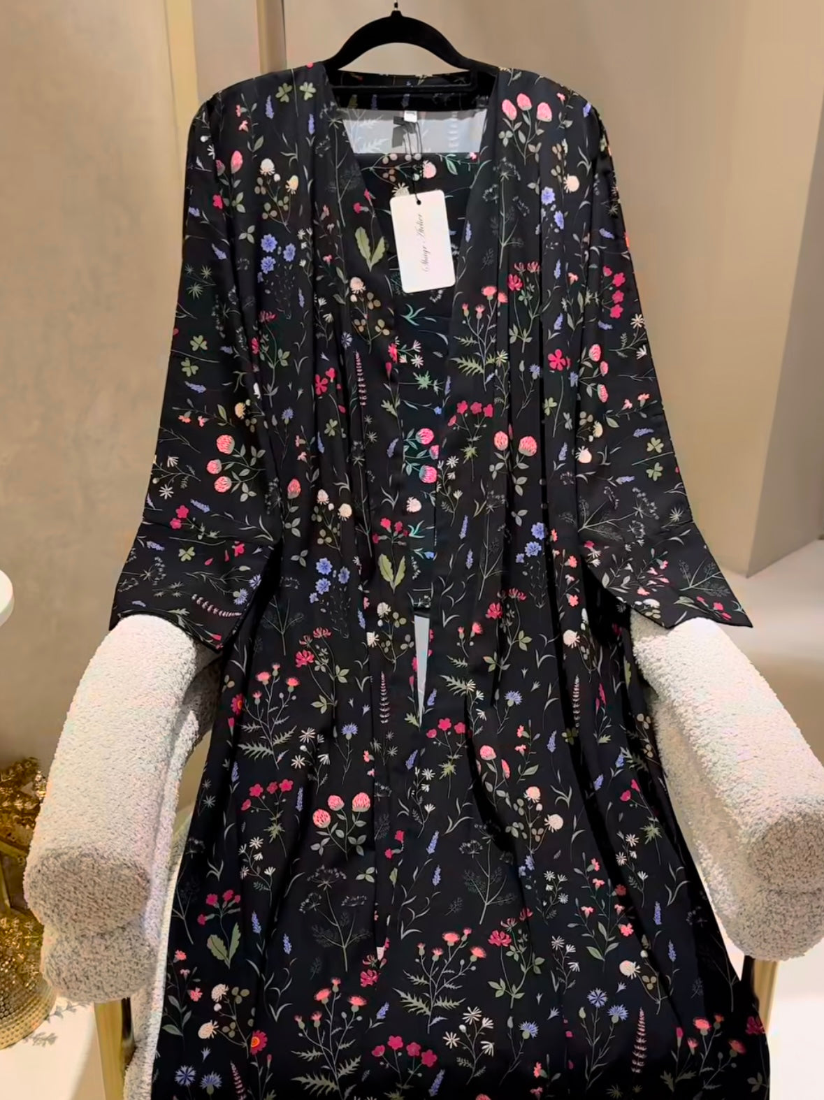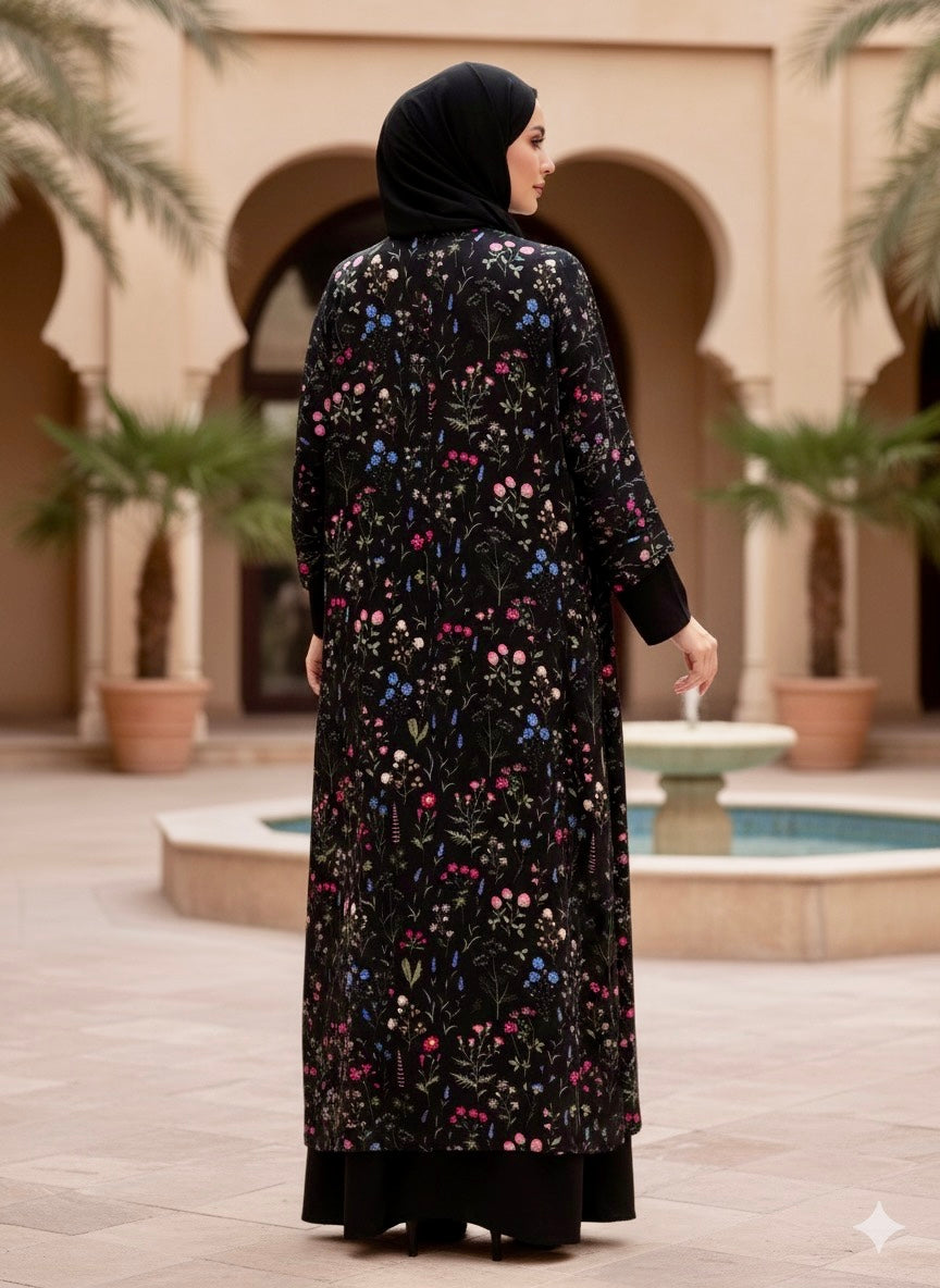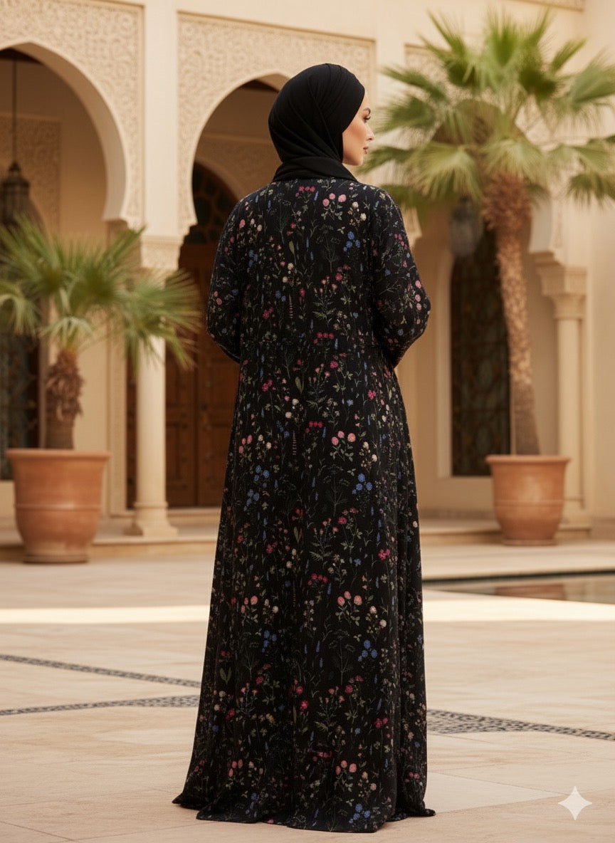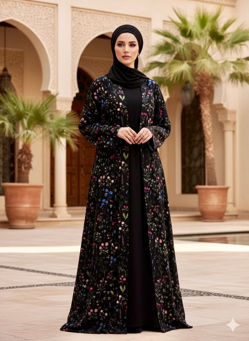 Beautiful stitched Abaya featuring elegant prints on whole with showcases how beautiful and cool abaya can look with complimenting color pop detailing.