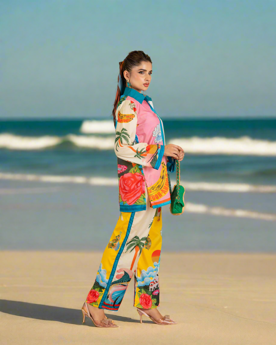 Beautiful stitched shirt and trouser featuring a beach vibe in printing on all over outfit. Your perfect resort wear.