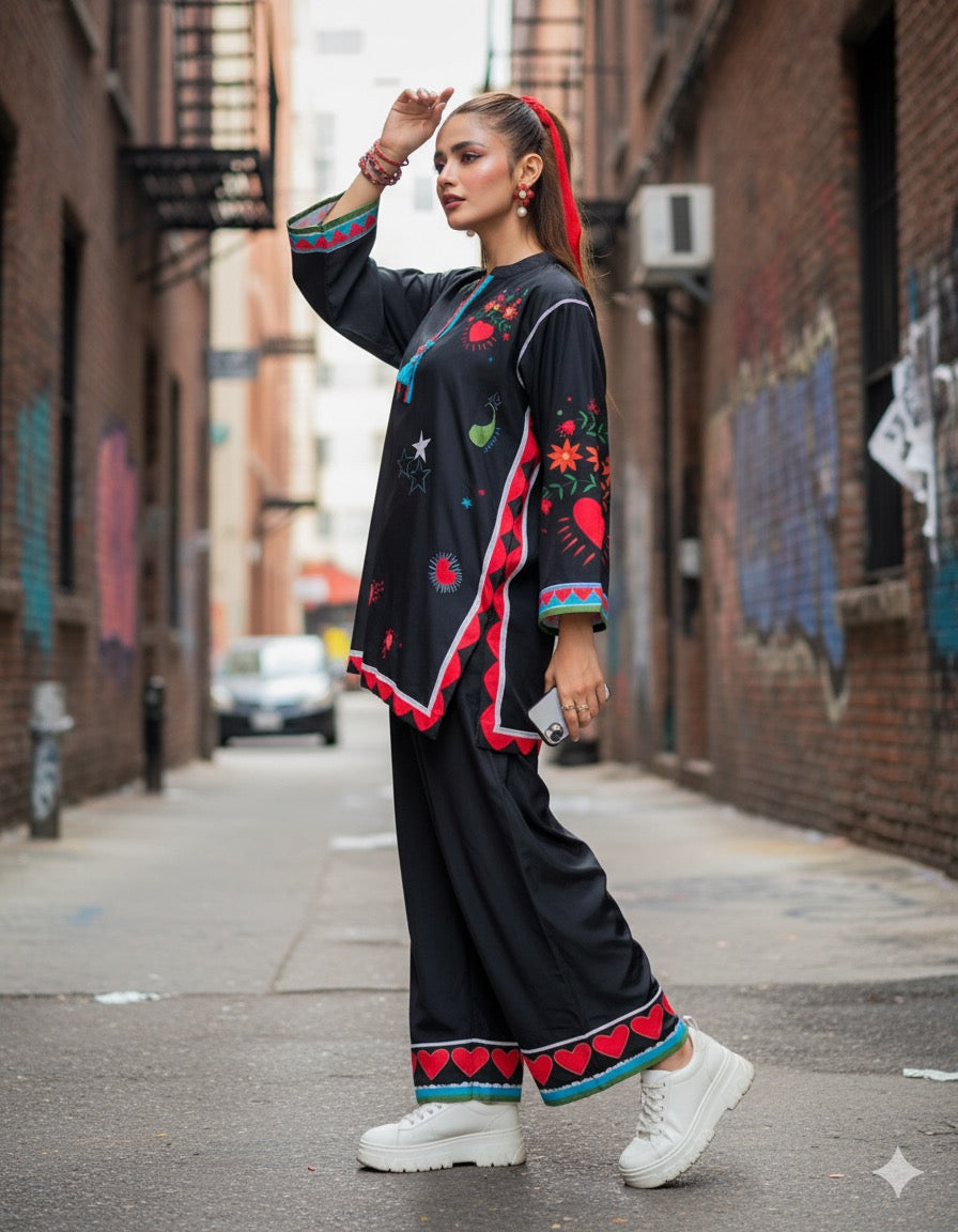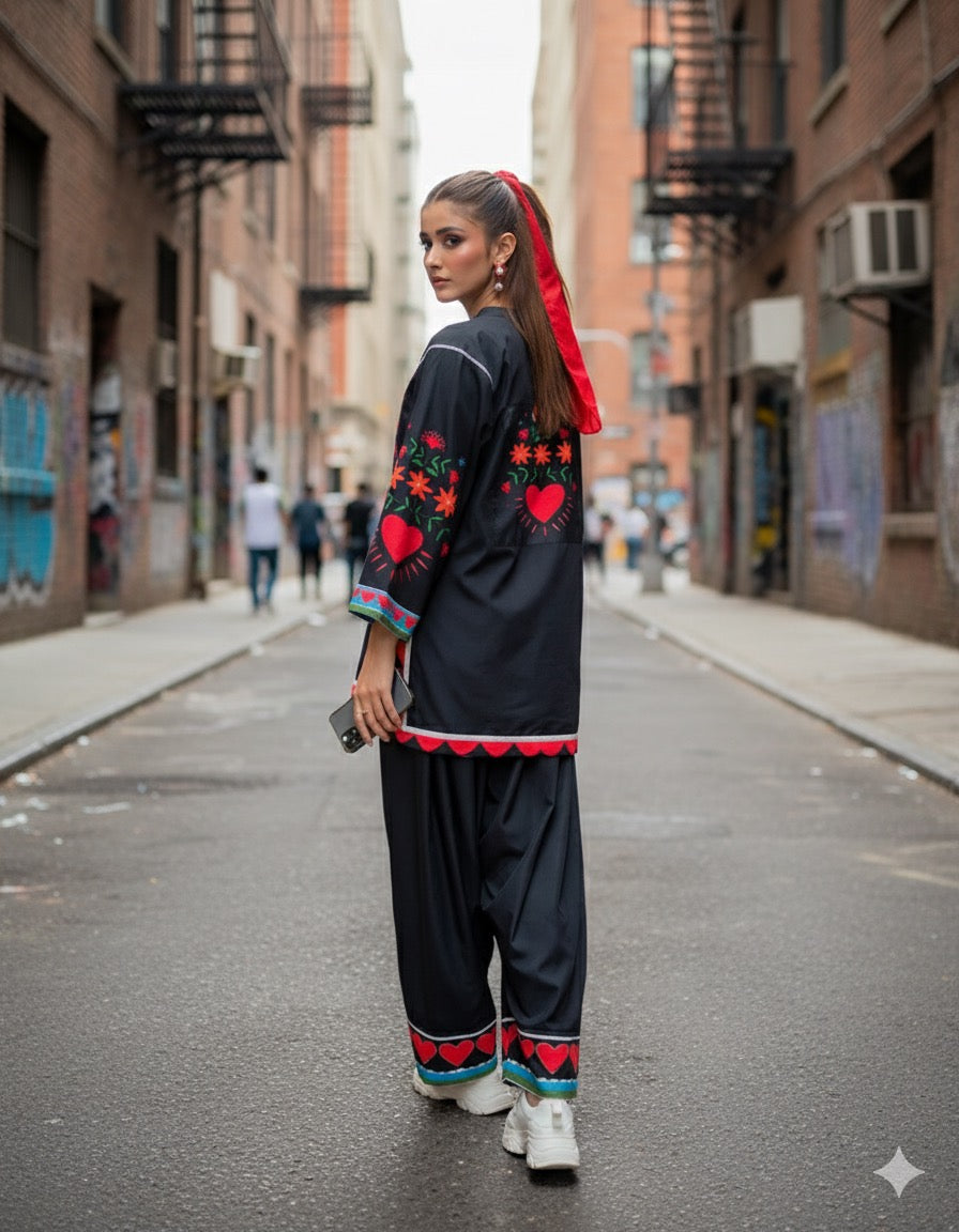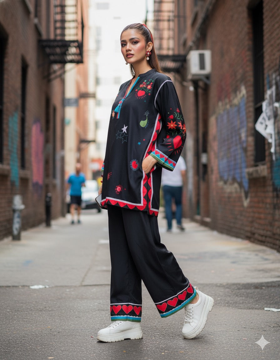 Beautiful stitched short shirt with farshi shalwar featuring a stylish design, a work of art.