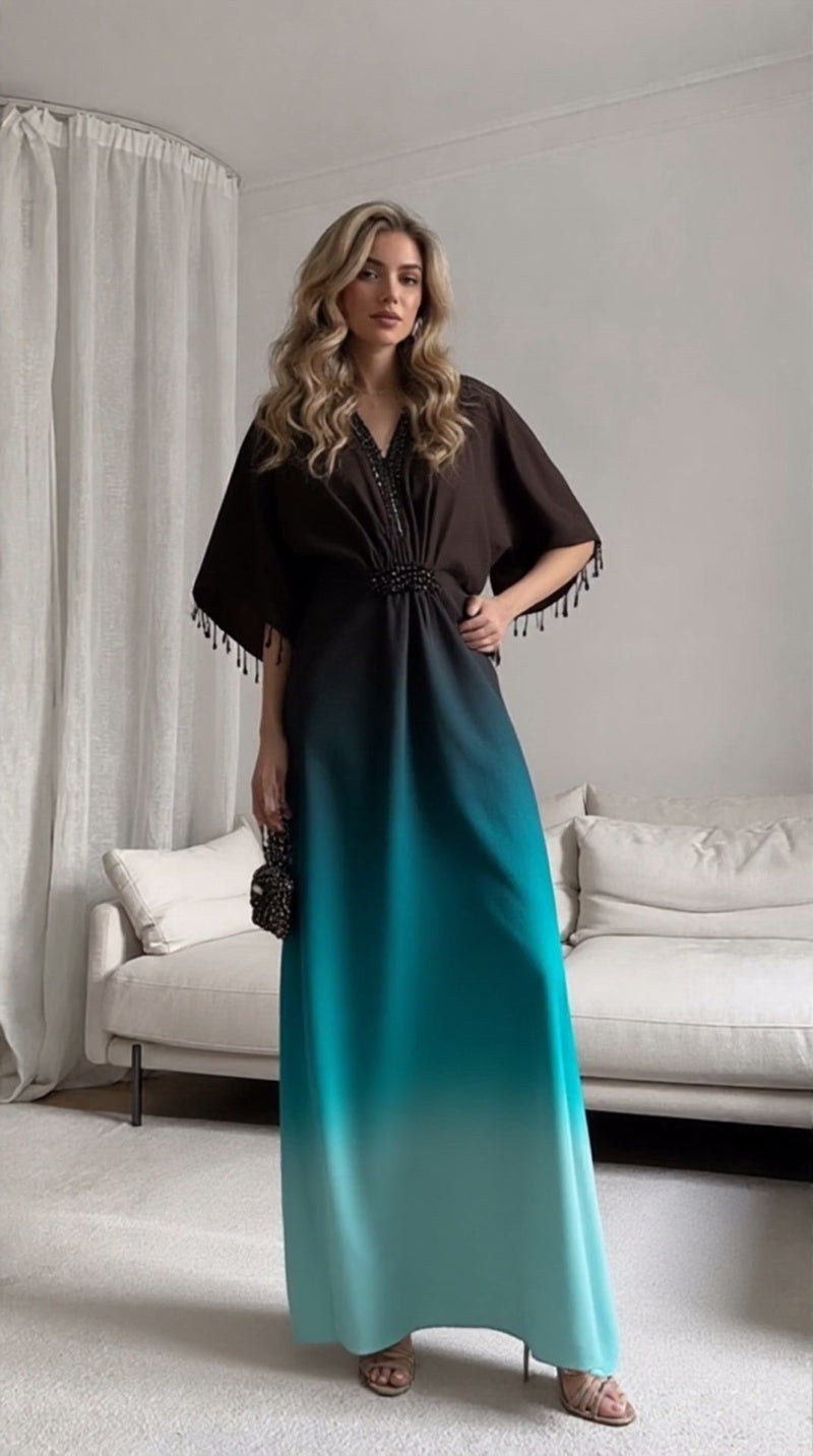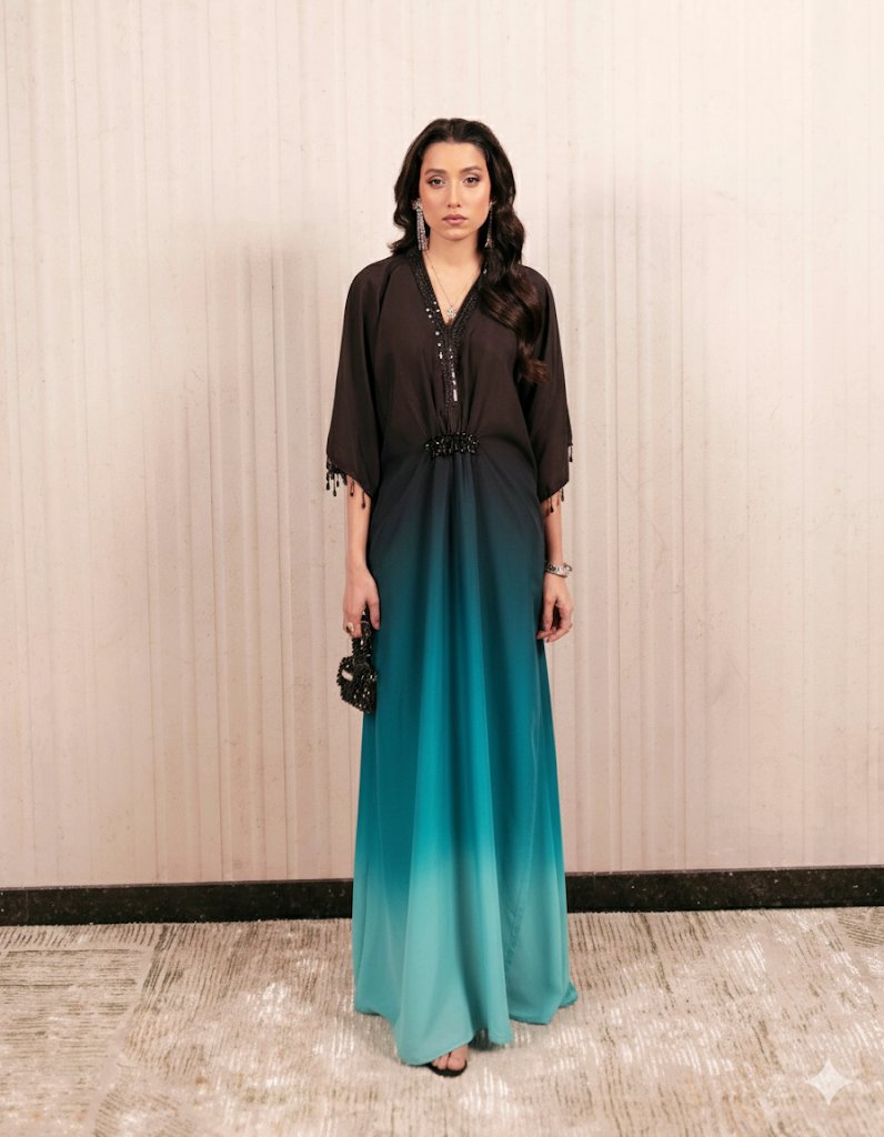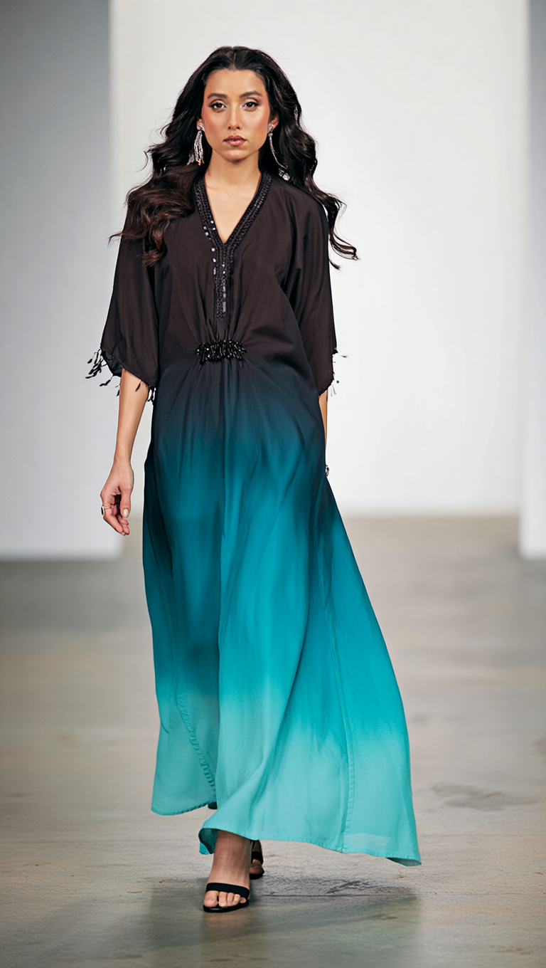 Details: Ombre printing on this Soft Crepe with hand made lace detailings on sleeves and a brooch on front, V neckline style.