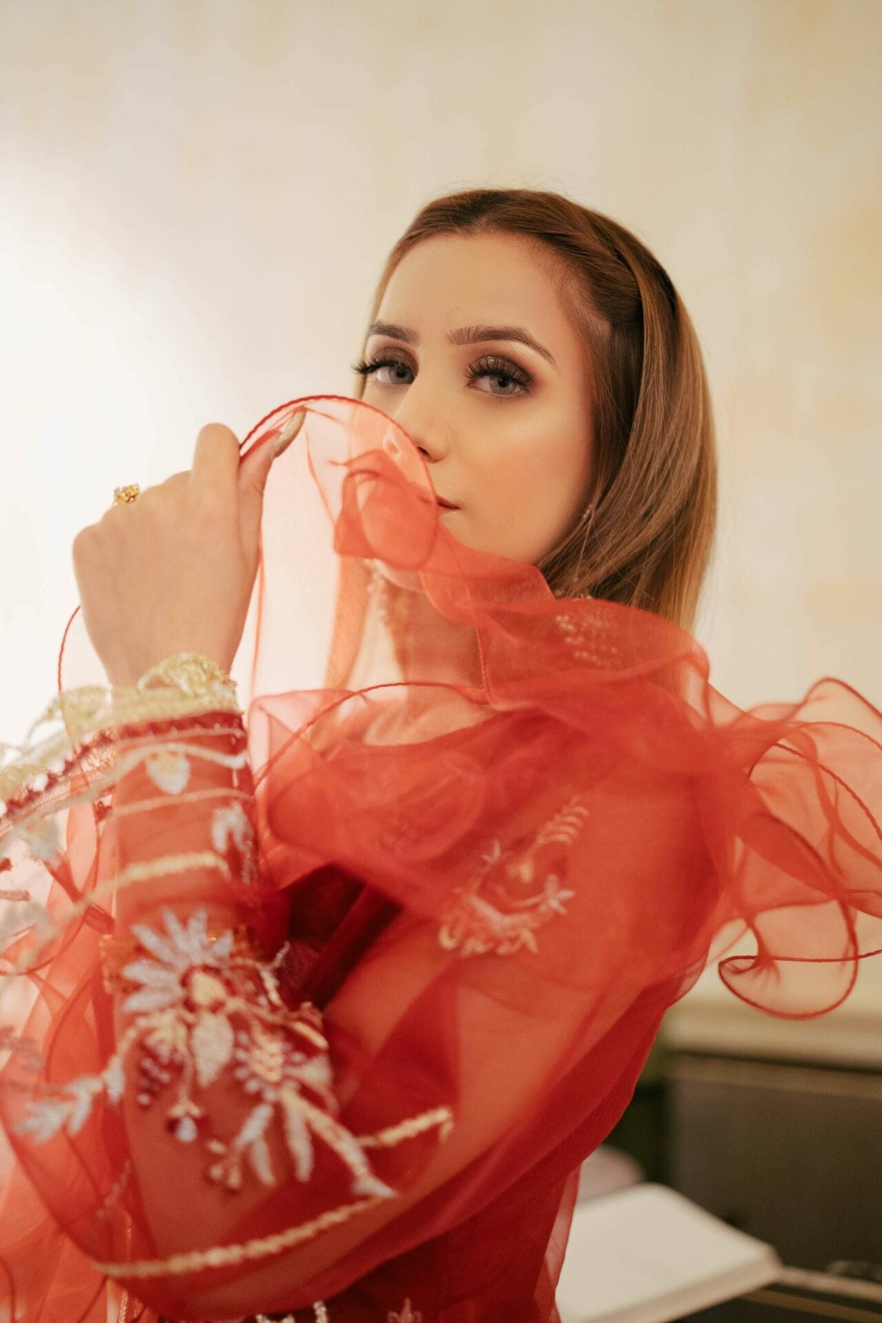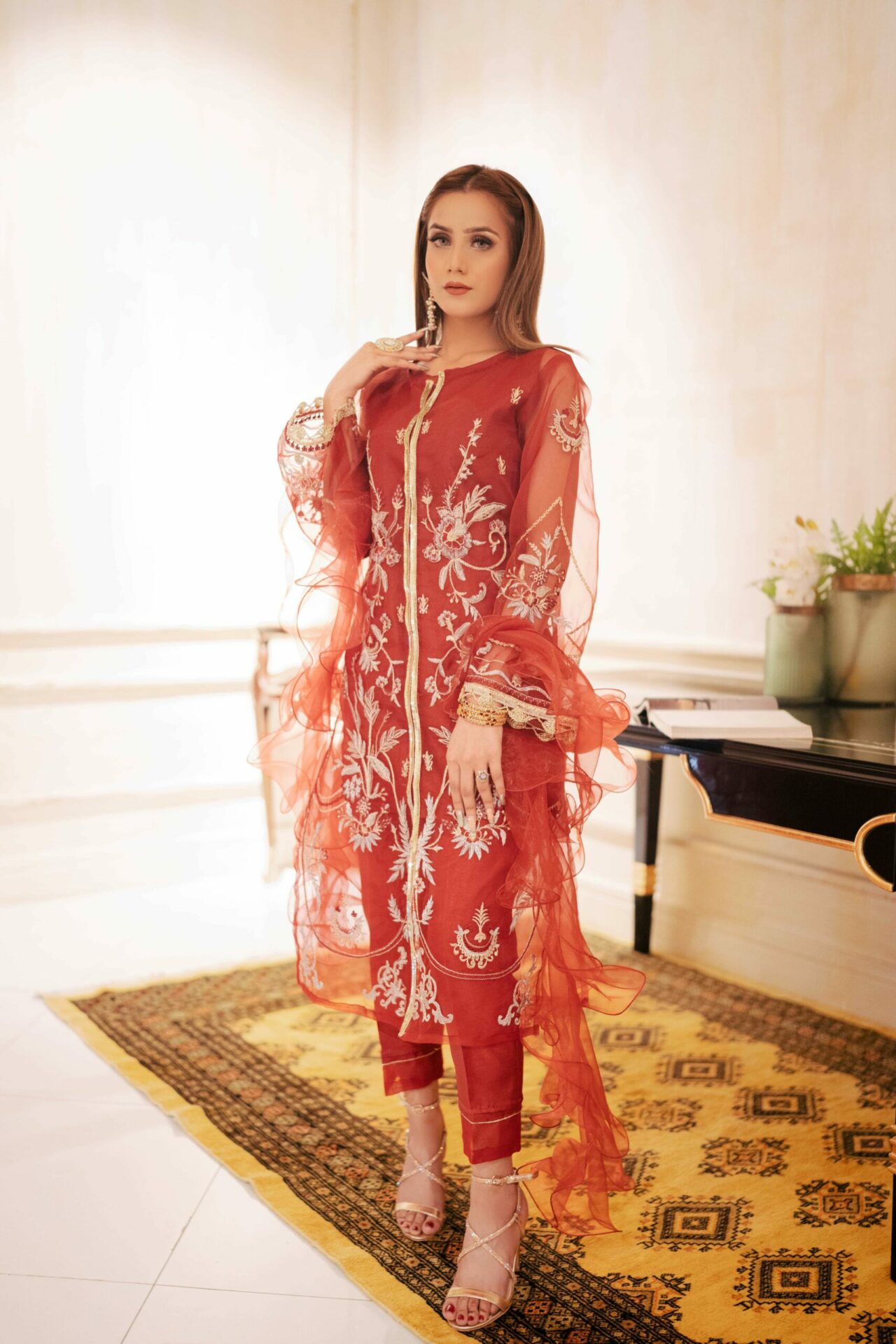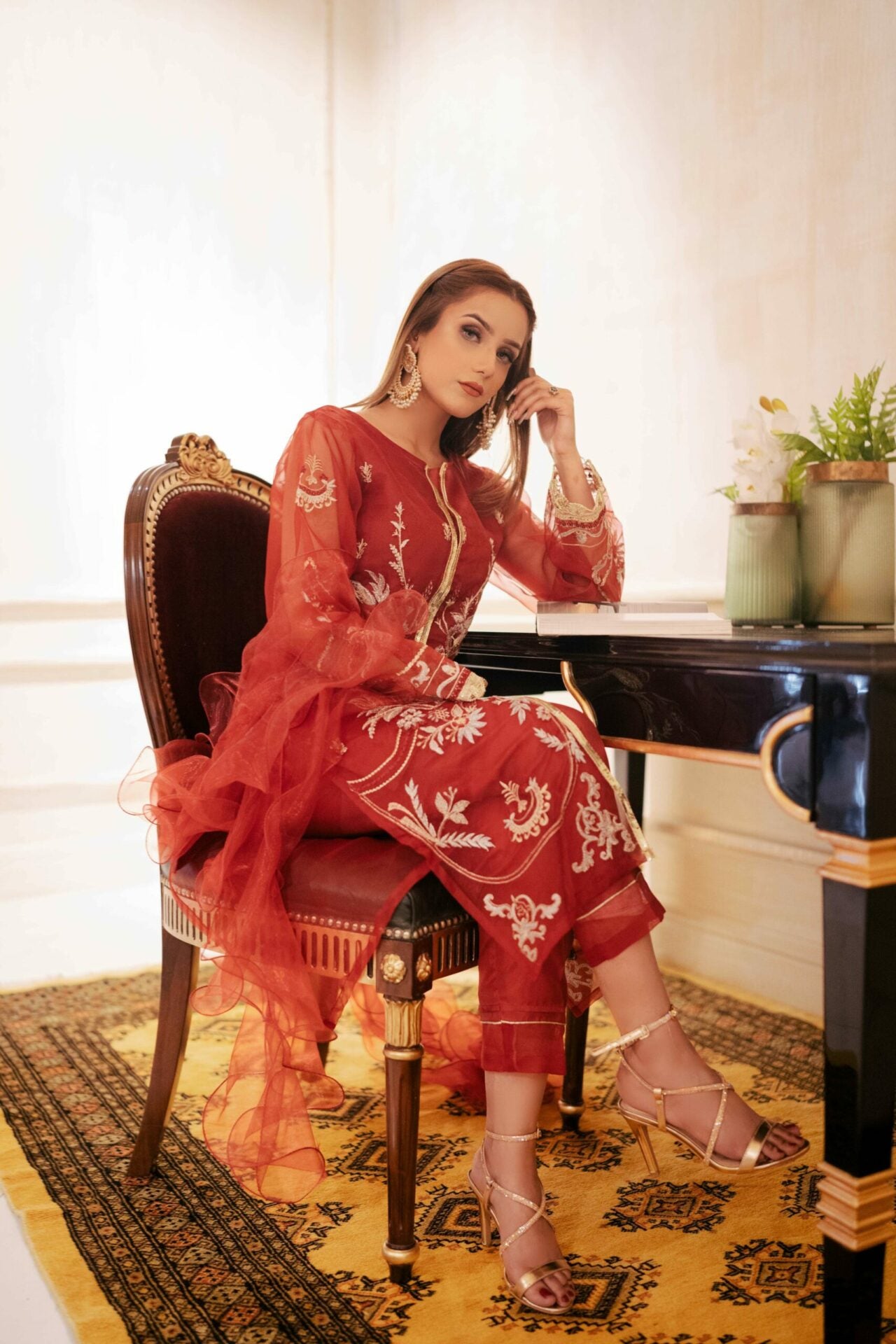 This finely stitched Jacket with intricate silver and gold tilla with red on red embroidery with delicate lace detailing’s, including inner shirt with pants.