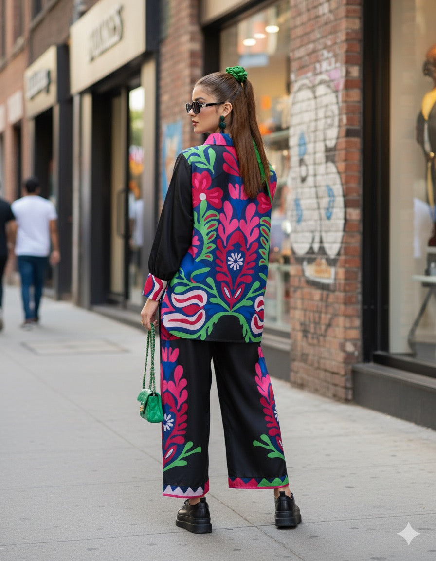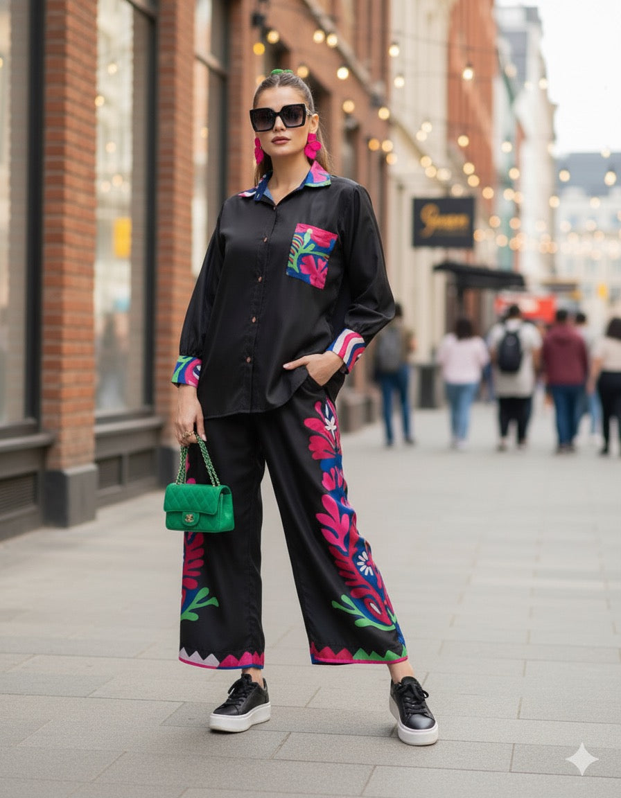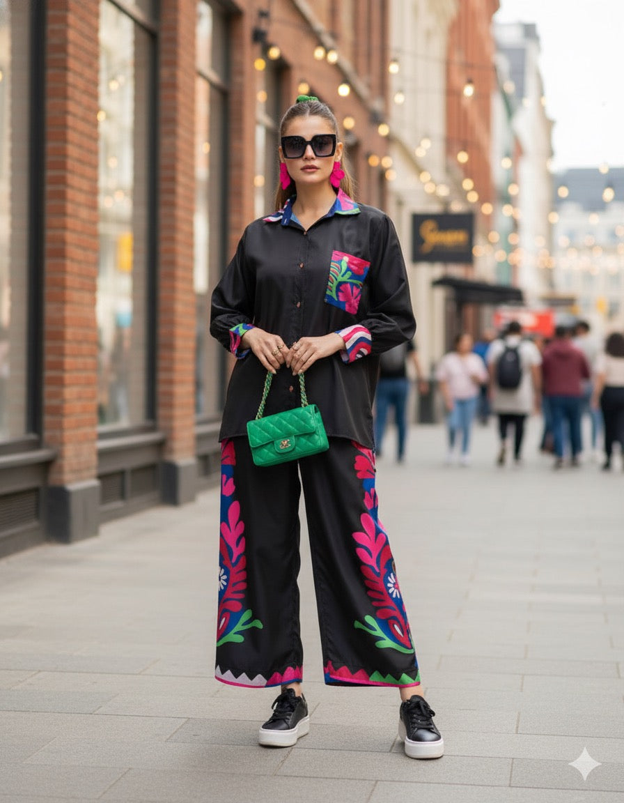 Beautiful stitched shirt and trouser featuring pop of colors in printing on back , pocket and sleeves cuffs.