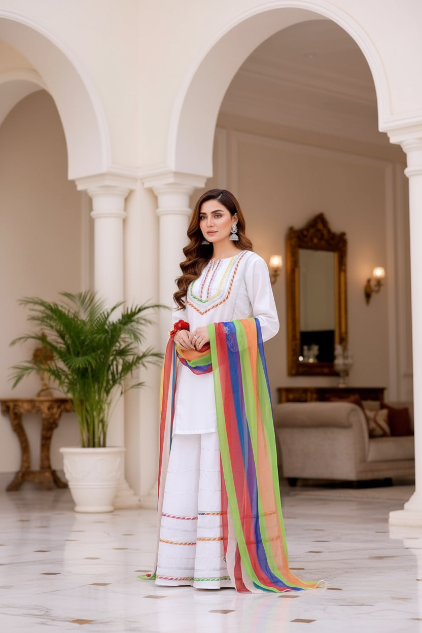 Details: This beautifully designed 3pc is portraying colors of our heritage such as shades of pink with greens with complementing dupatta and stylish culott.
