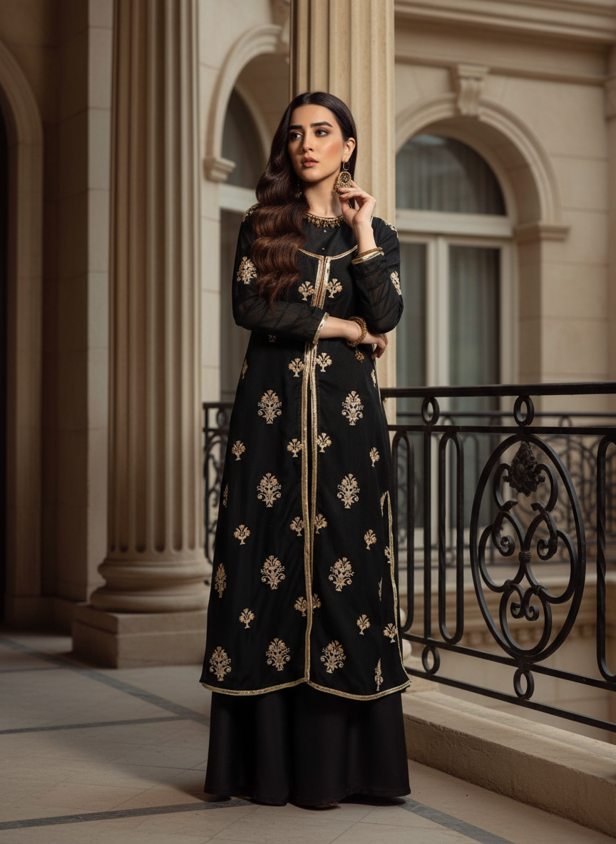 Stand out this season with this all black outfit features designer neck with hand embelishment.