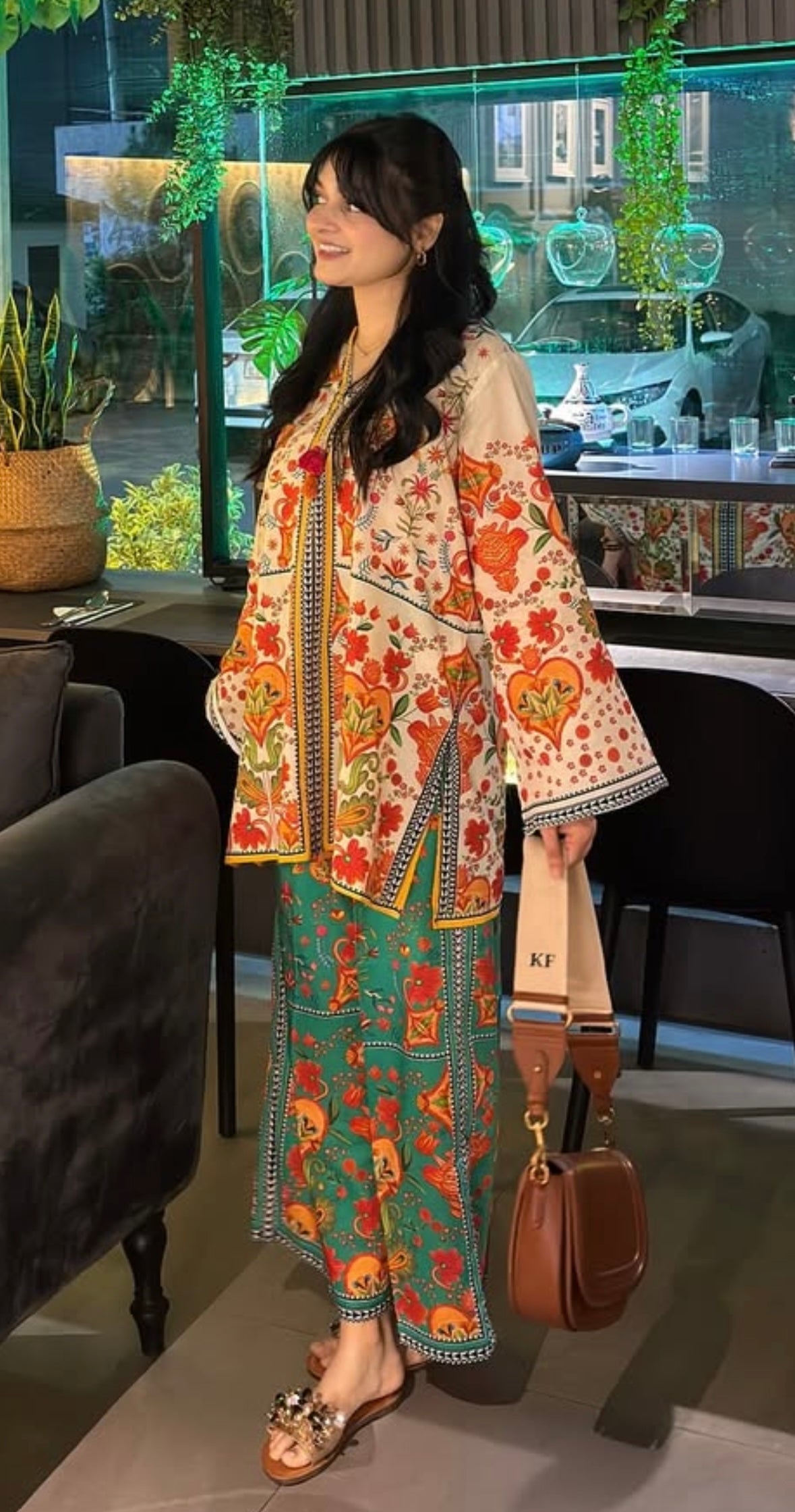 Details: Soft crepe fabric with stylish printing all over design, tassel lace on boat neckline with a slit.