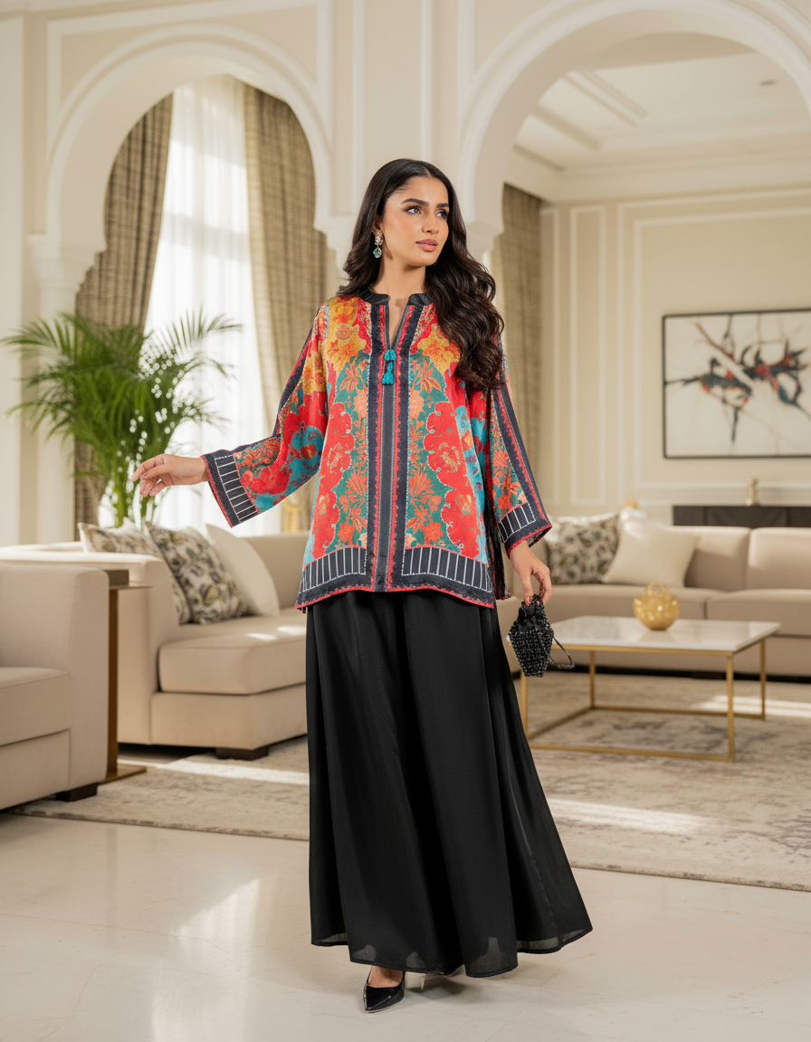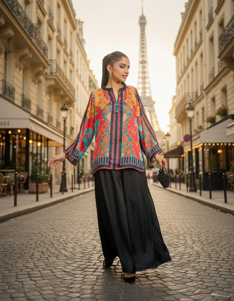 Beautiful stitched shirt and plazo featuring artsy print with vibrant colors  on all over the shirt.
