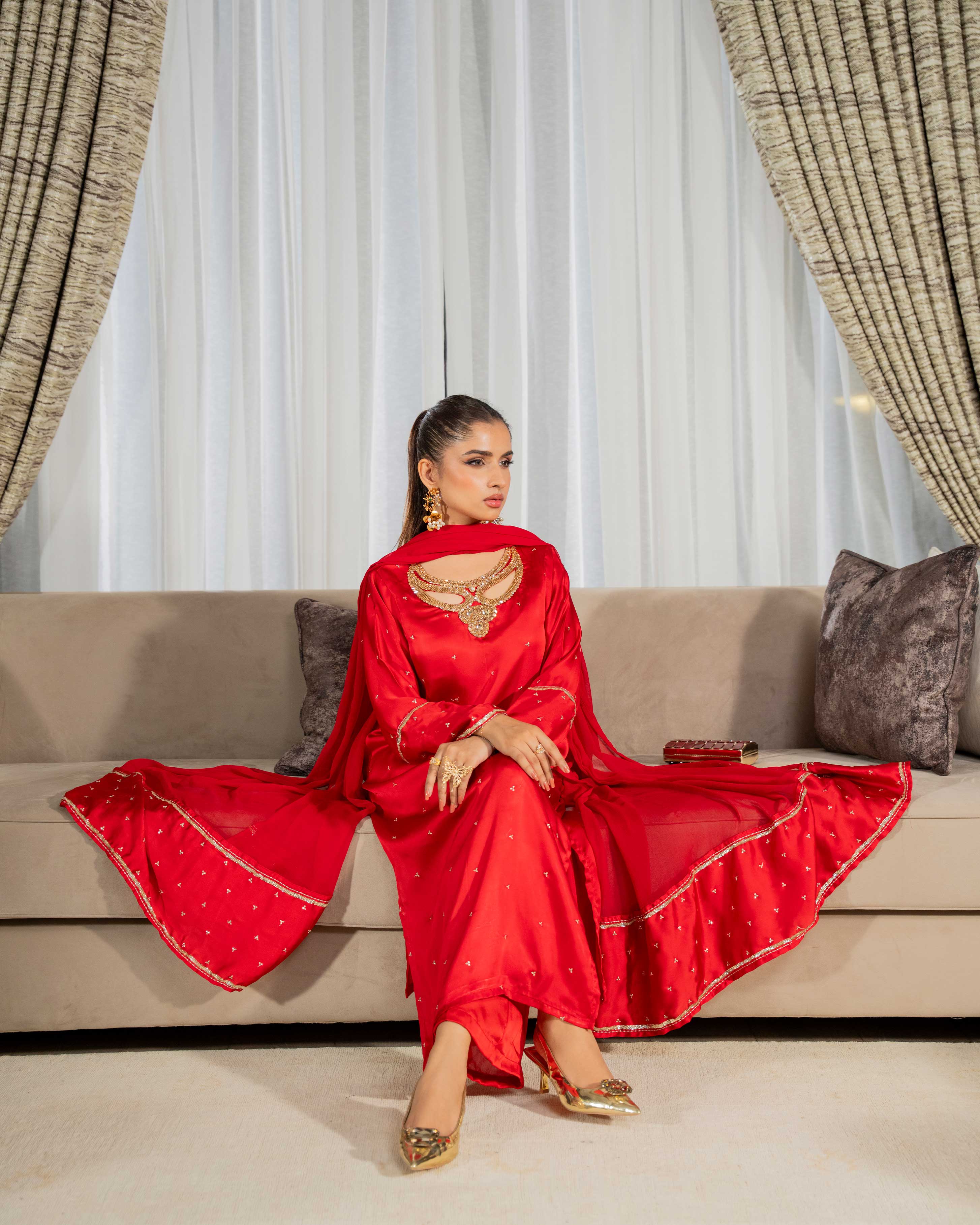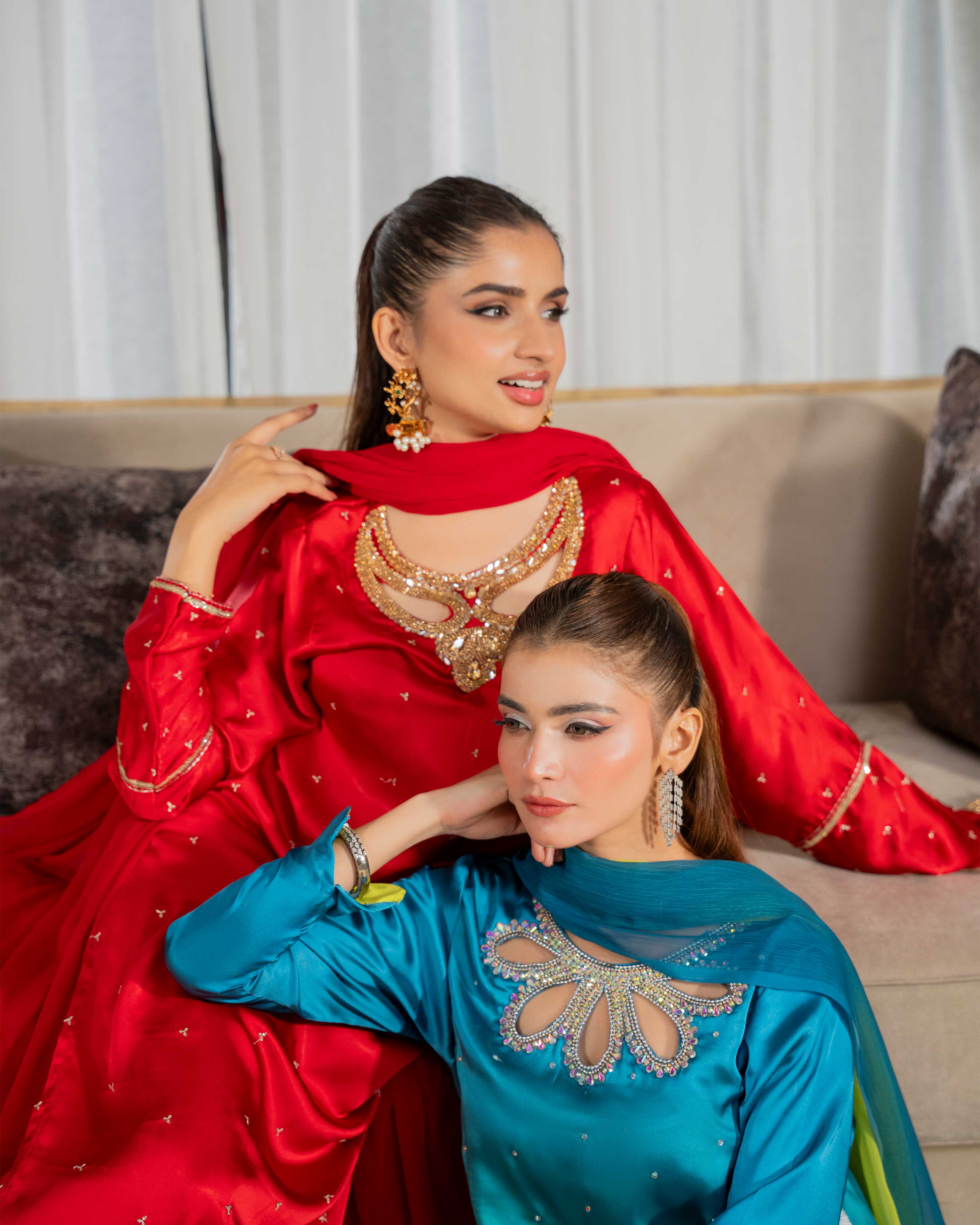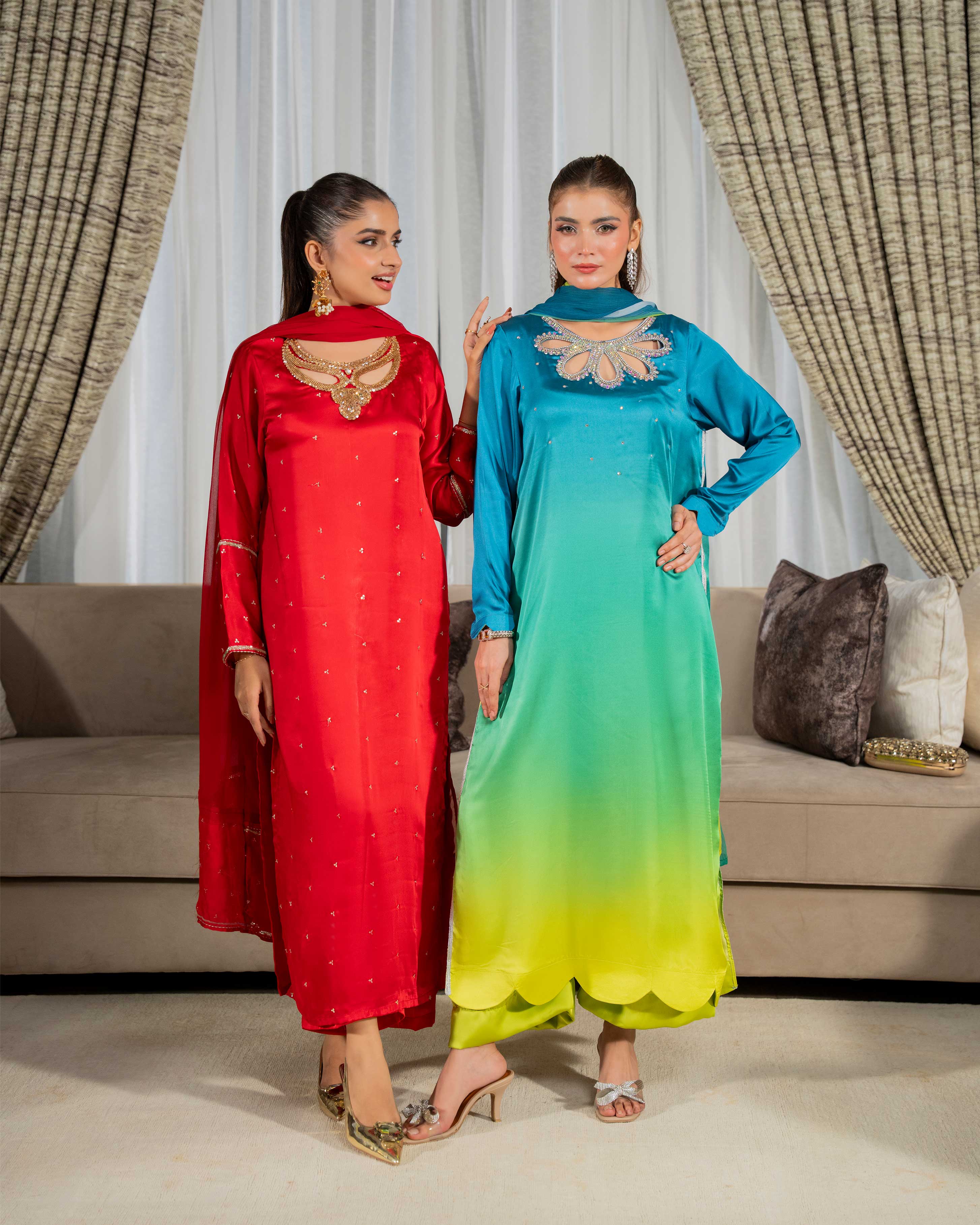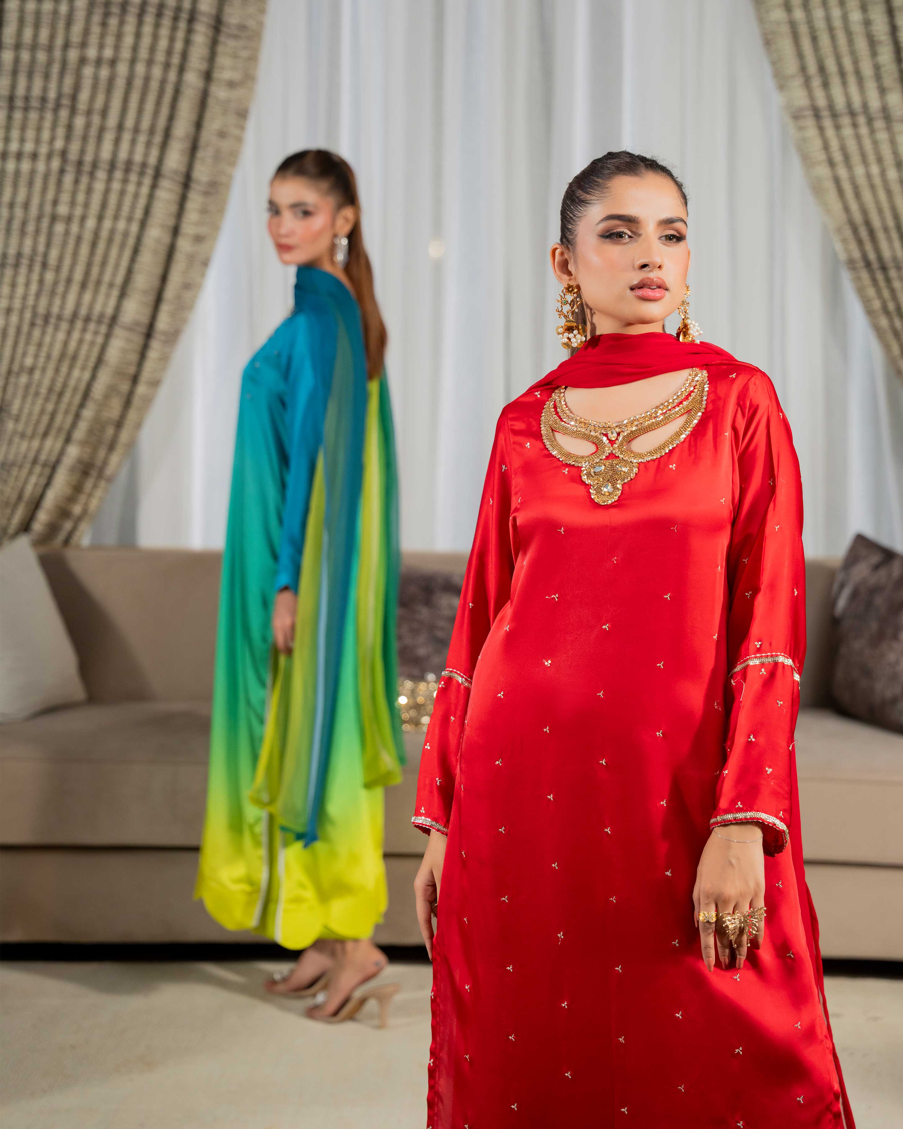 Details: Silky fabric with sequin work on front, sleeves and dupatta, with a designer neckline and chiffon dupatta.