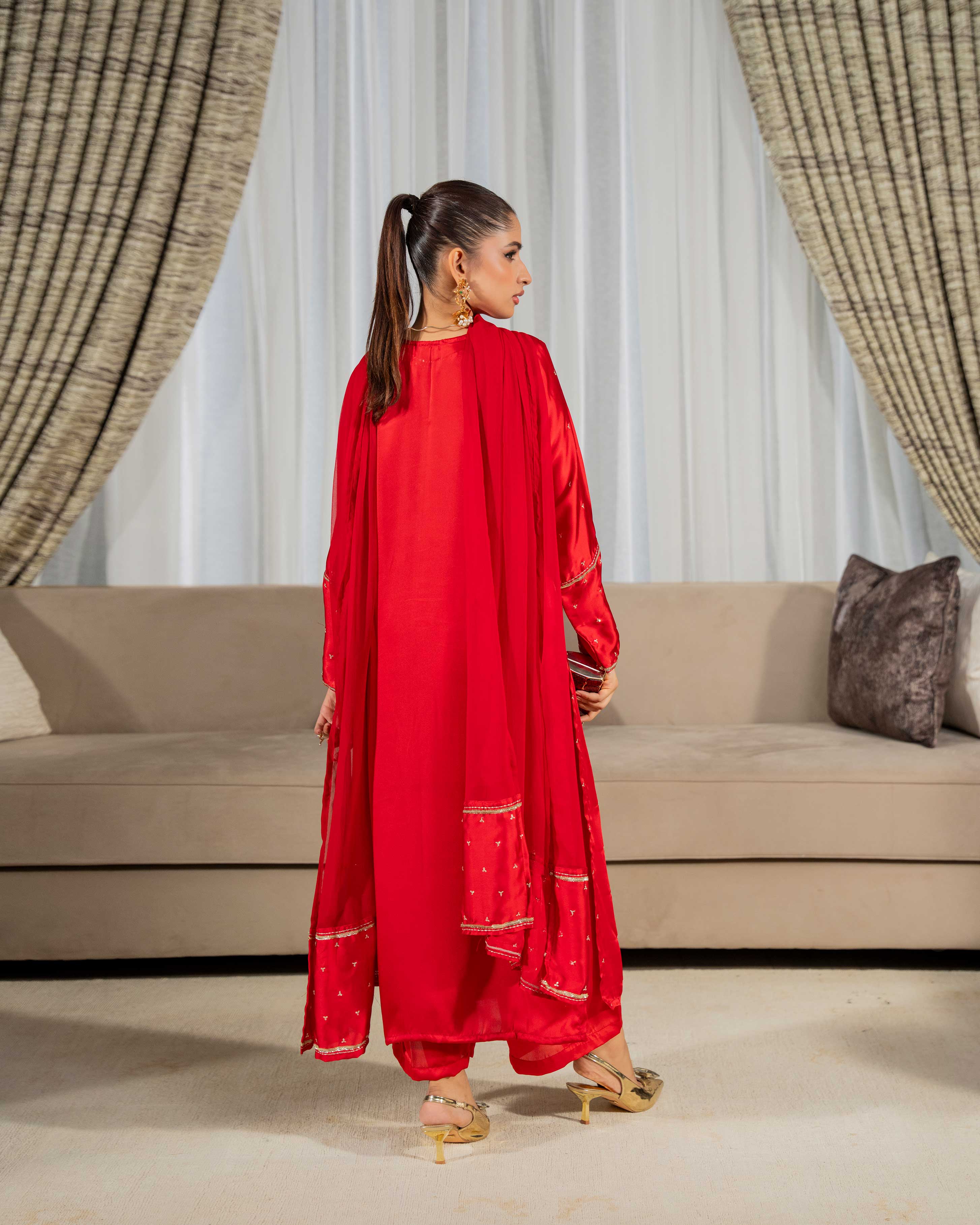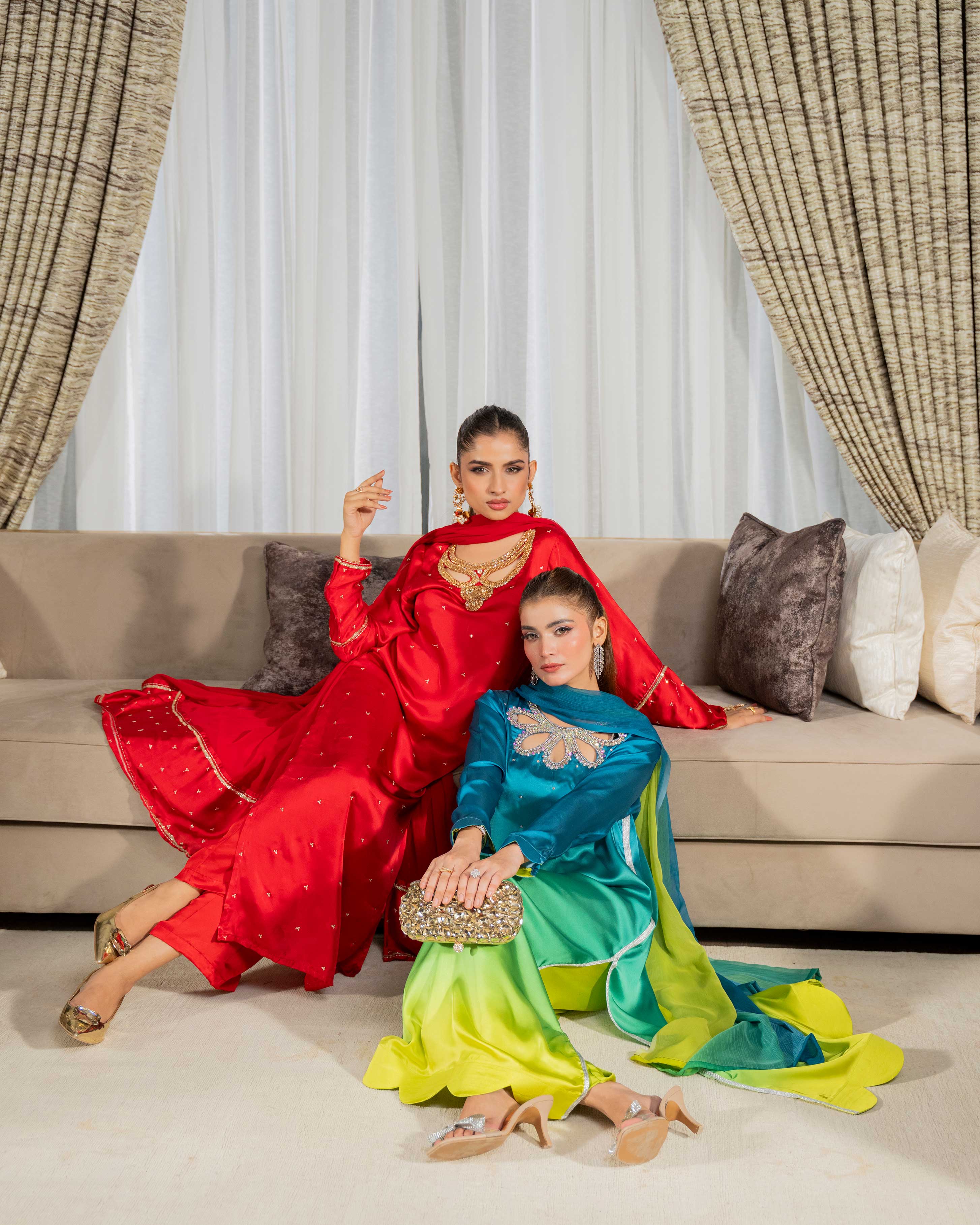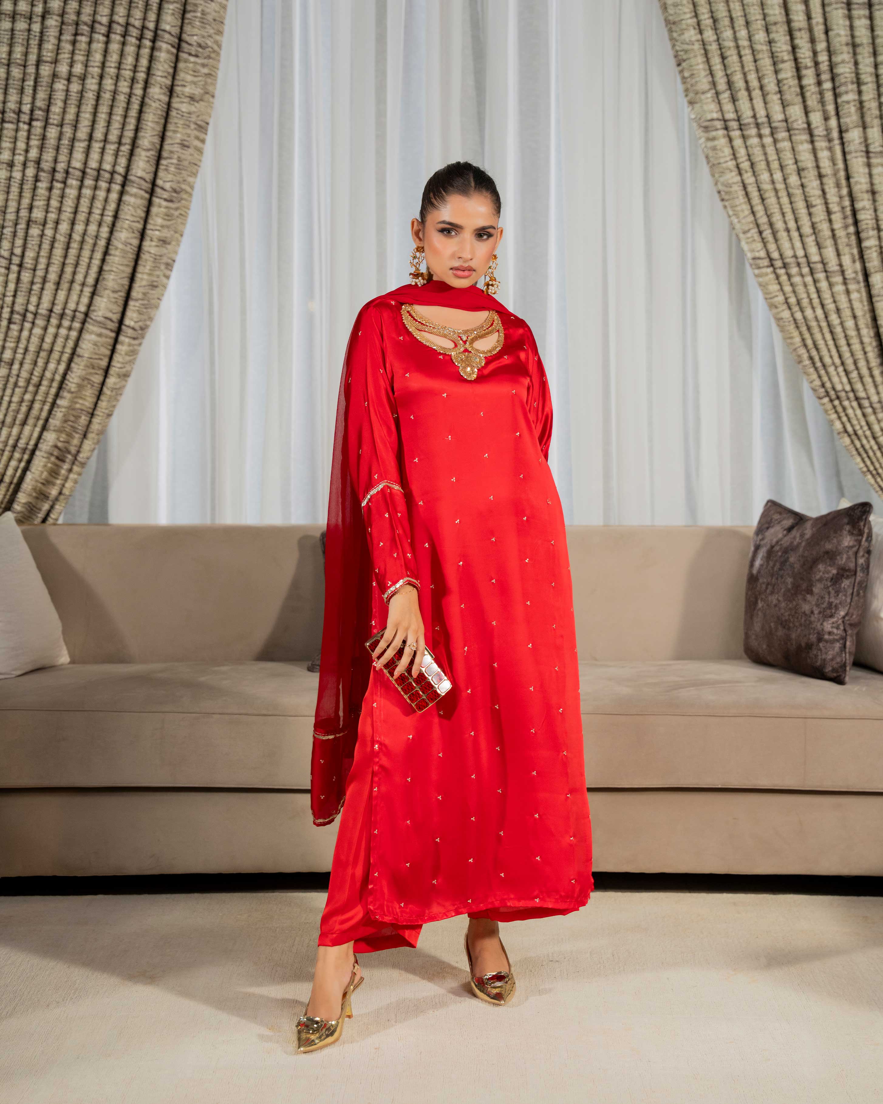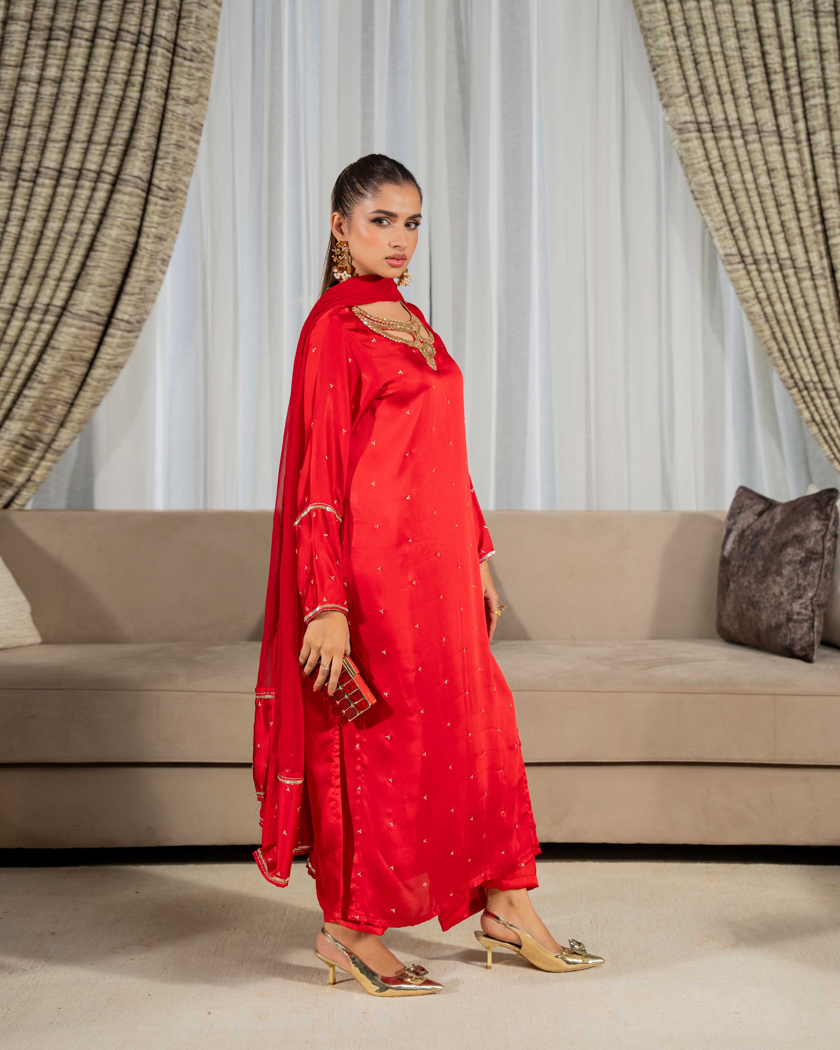 Details: Silky fabric with sequin work on front, sleeves and dupatta, with a designer neckline and chiffon dupatta.