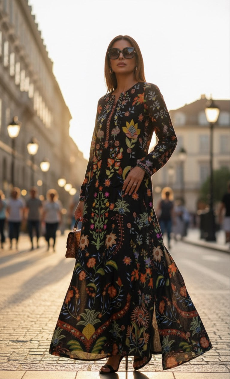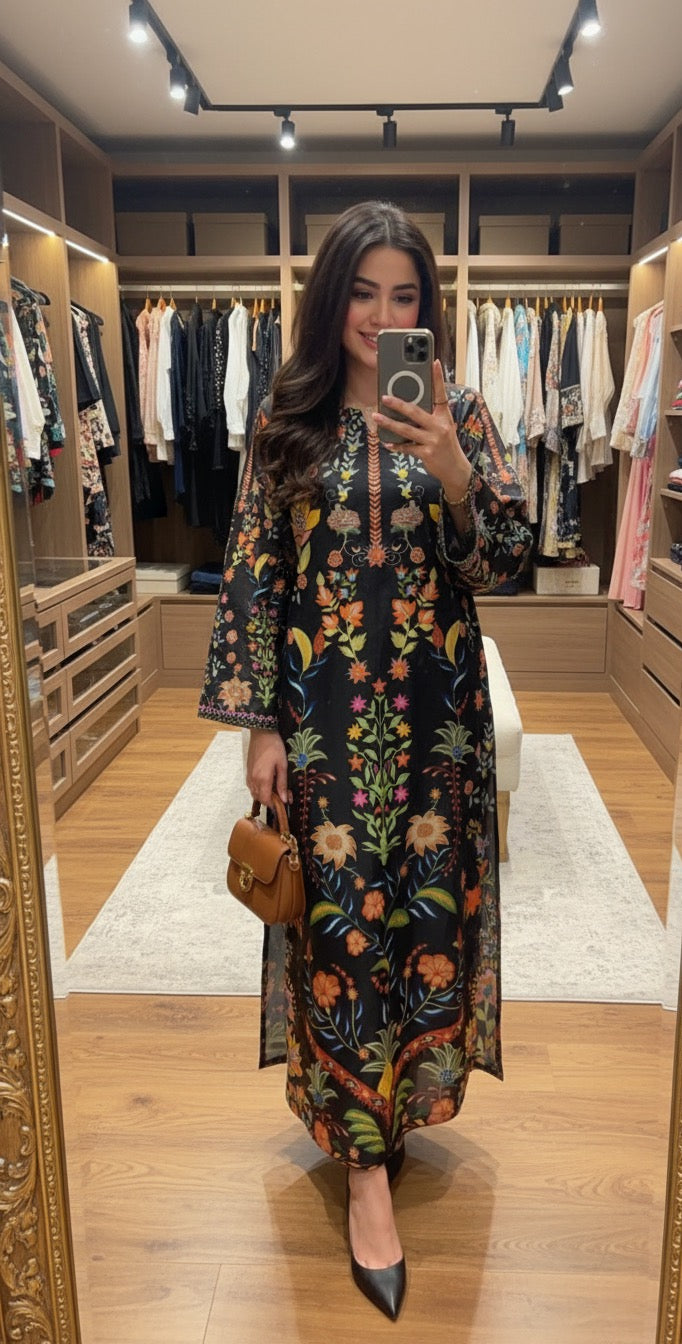 Beautiful stitched long shirt featuring elegant prints on whole with slits on sleeves that showcases beautiful complimenting color pop detailing.