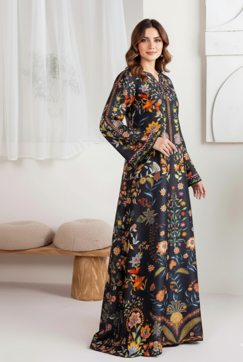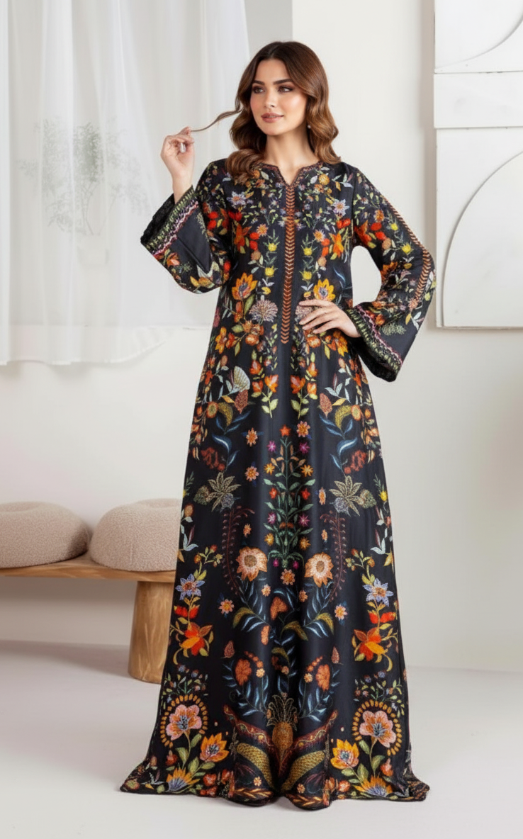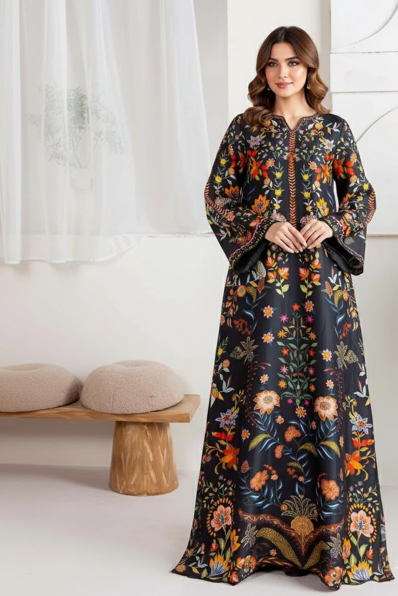 Details: Stylish long shirt featuring print on front and back with printed sleeves and scalping on sleeves and ghaira, stylish neckline.