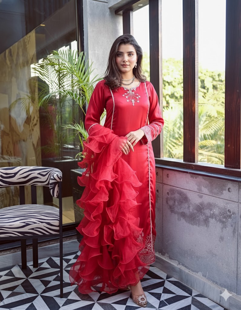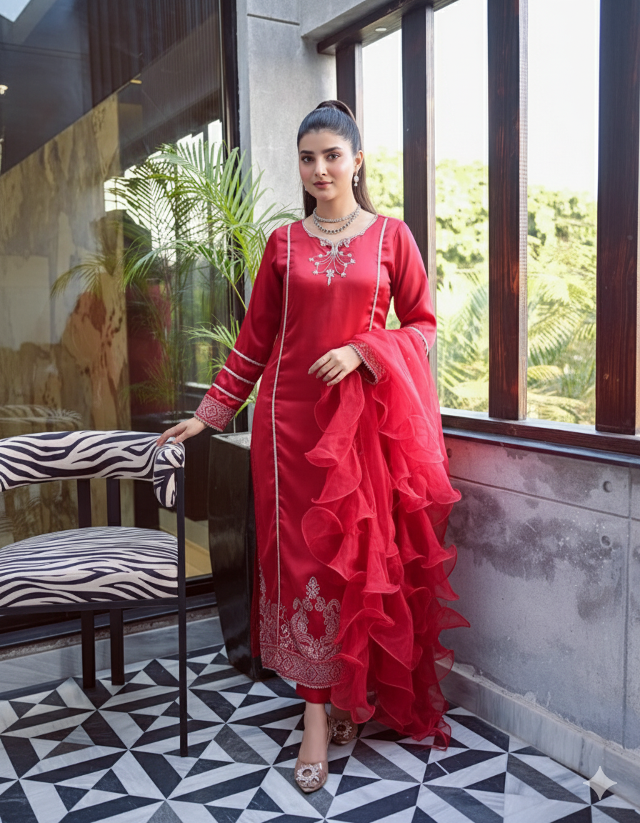 3-piece Shirt Fabric: Finest Quality Silk Shirt length: 48-50 inches Pants Fbaric : Finest Quality Silk Dupatta Fabric : Organza   Color of the product slightly vary due to photographic lighting or your device settings.