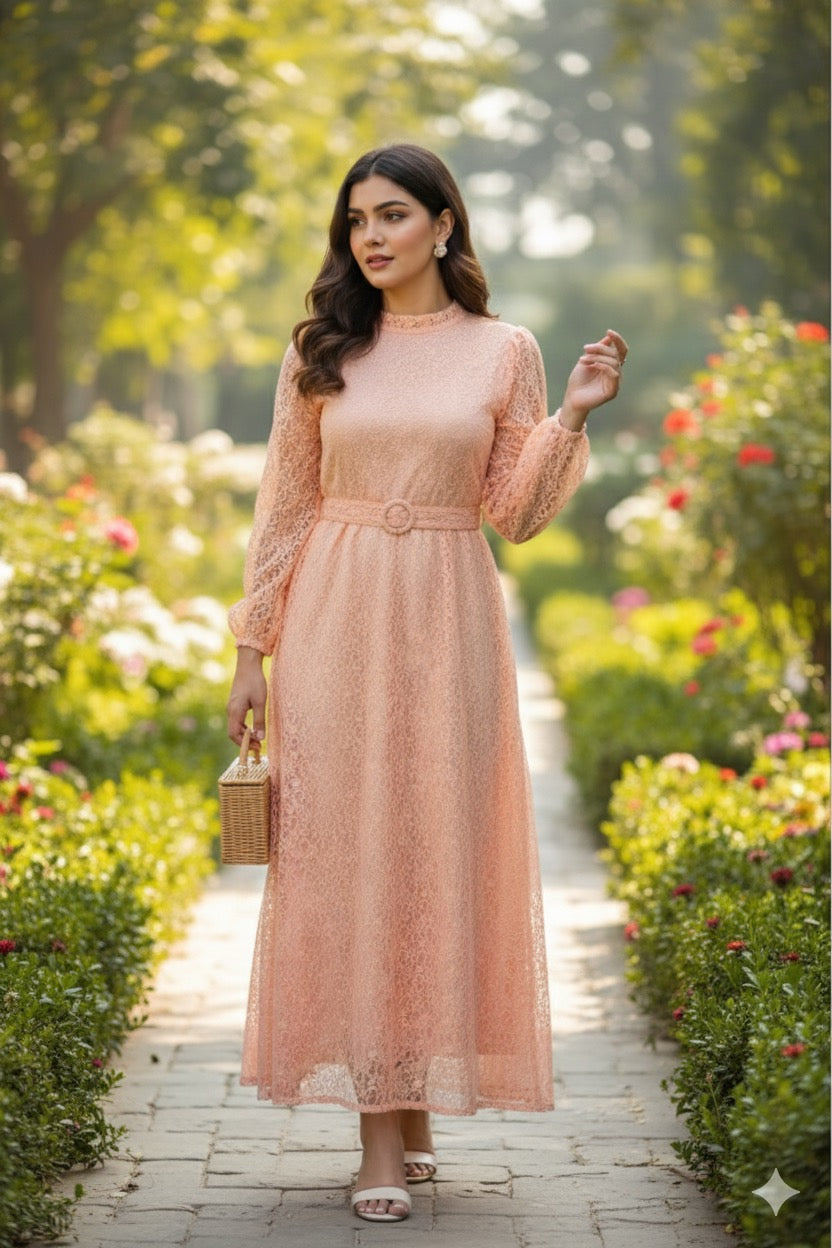 Details: Intricate flower patterned net flairy frock is finely stitched with attached inner and silver belt complementing the outfit.