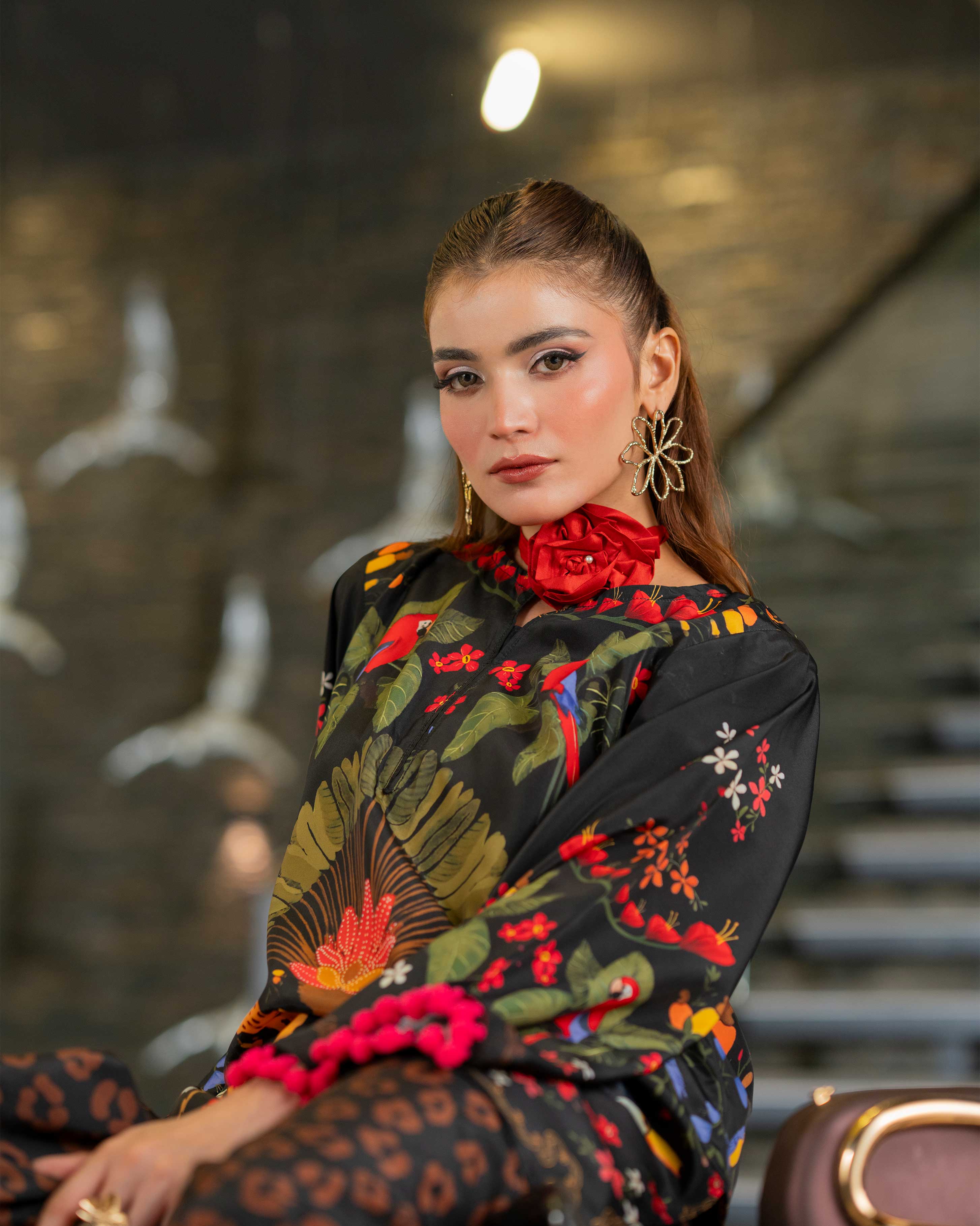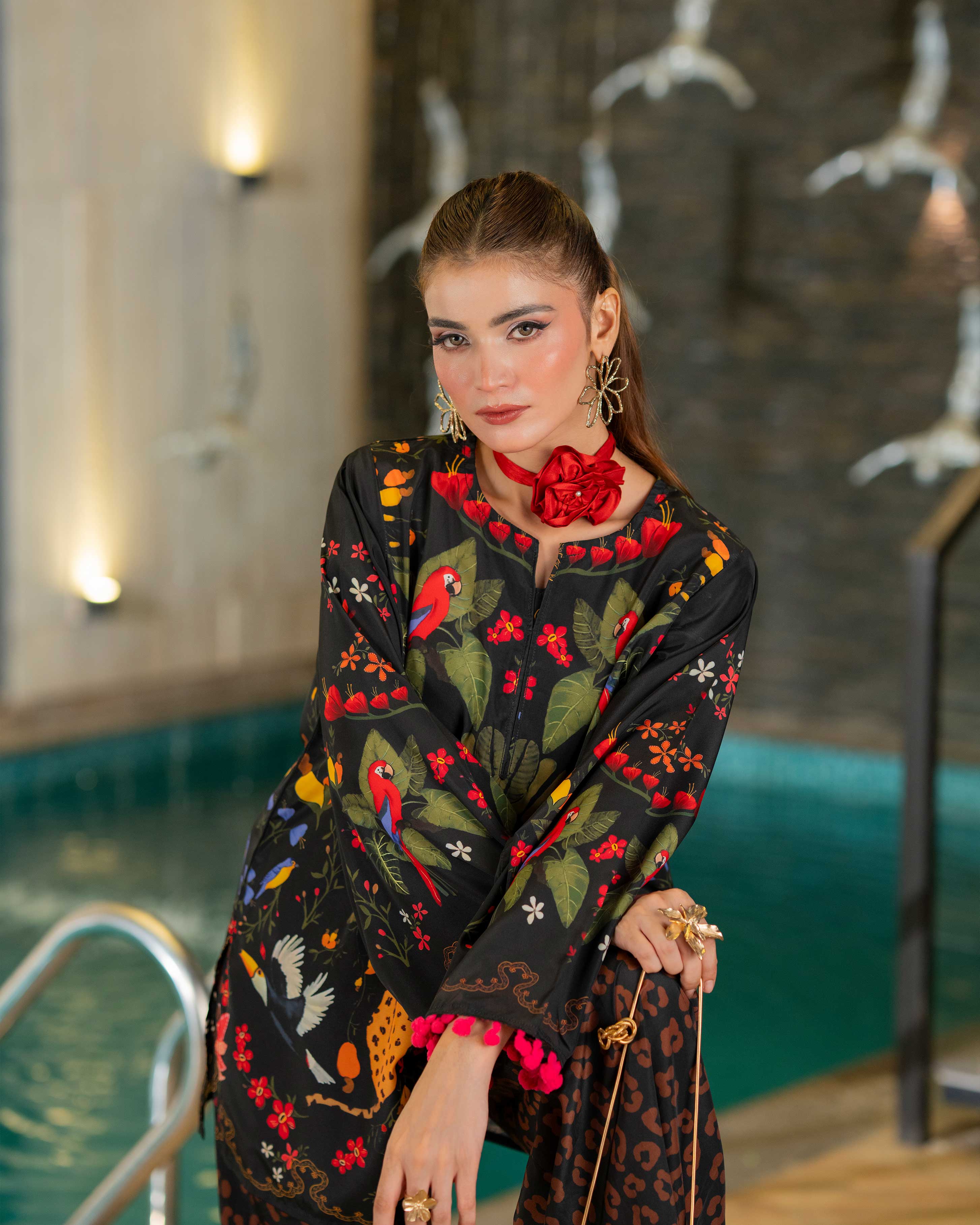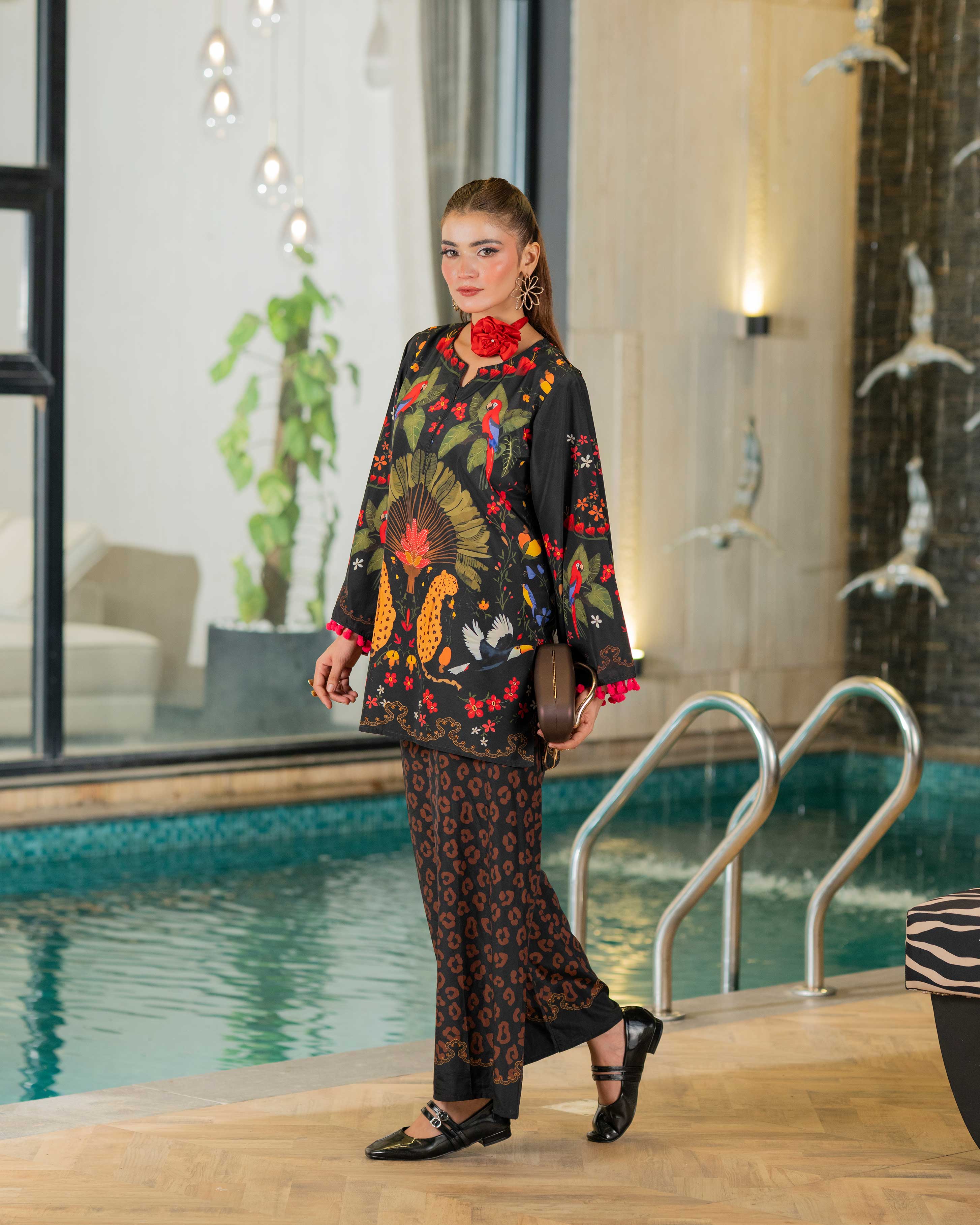 Details: Soft crepe fabric with stylish printing all over design, pompom lace on sleeves and a boat neckline with a slit.