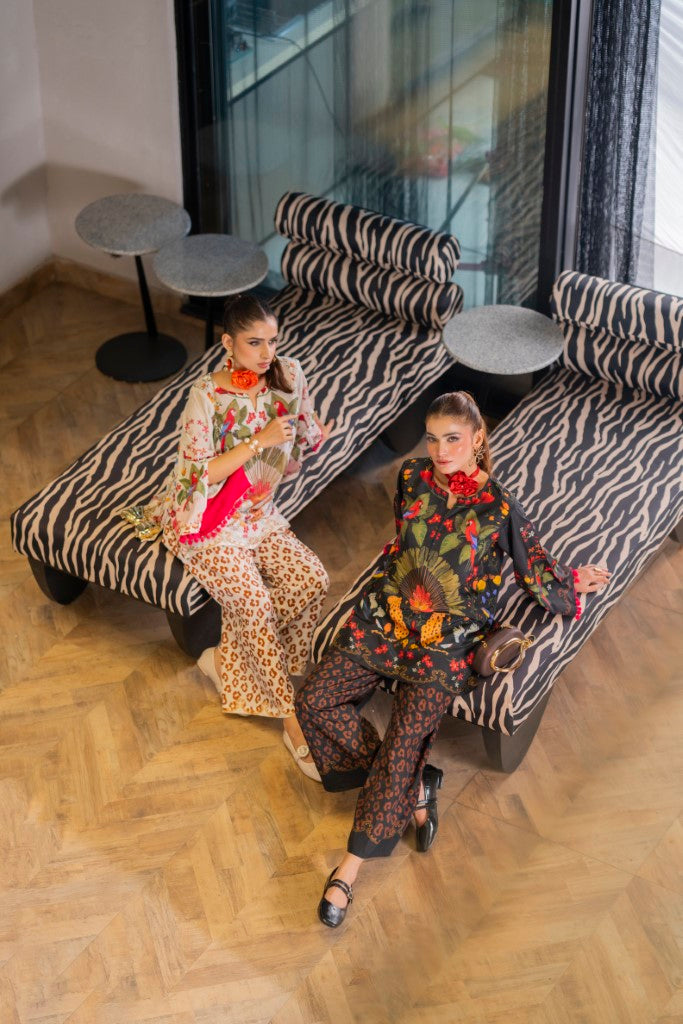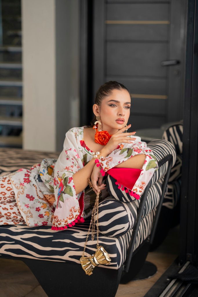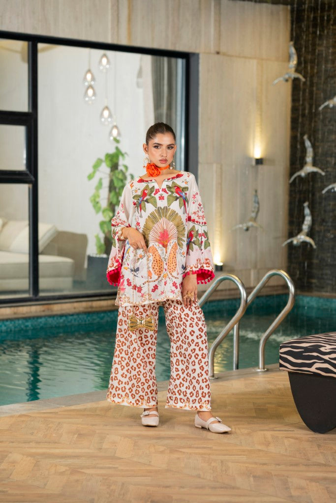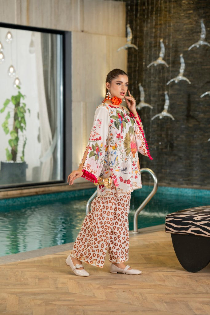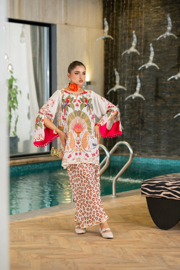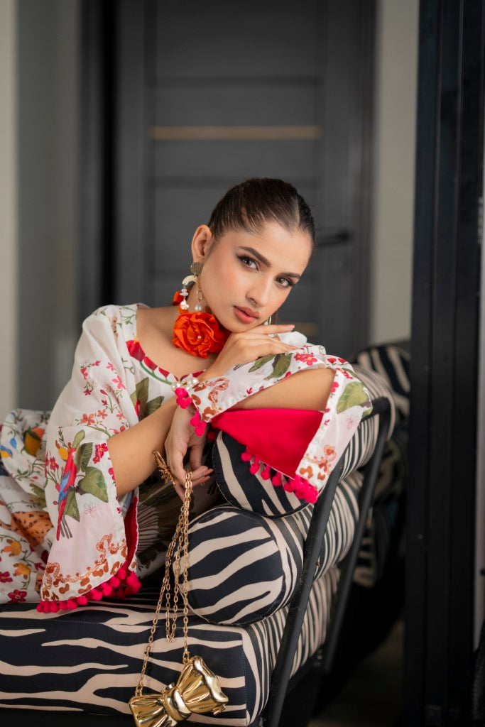 Details: Soft crepe fabric with stylish printing all over design, pompom lace on sleeves and a boat neckline with a slit.